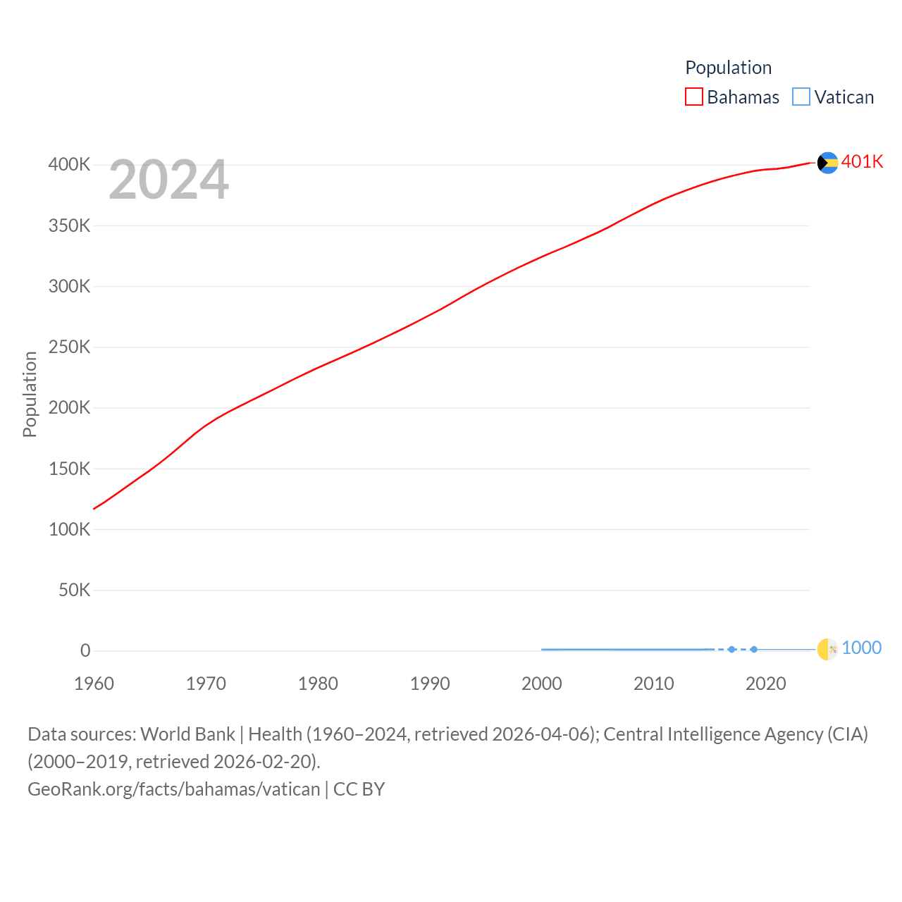 The Bahamas has a population of 401K (ranked 172/197), compared with 1K in The Vatican (ranked 197/197). The Bahamas' land area is 3,865 sq mi versus 0.17 sq mi for The Vatican (ranked 162nd vs. 197th).
