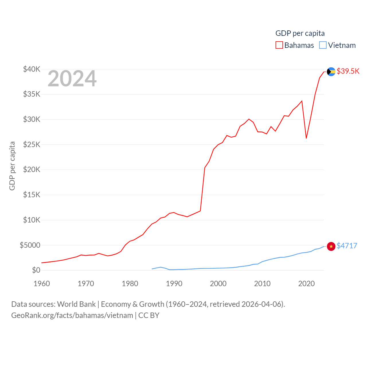 By GDP, The Bahamas ranks 140/197 ($15.8B) and Vietnam ranks 33/197 ($476B). By GDP per capita, The Bahamas ranks 30/197 ($39,455), while Vietnam ranks 122/197 ($4,717).