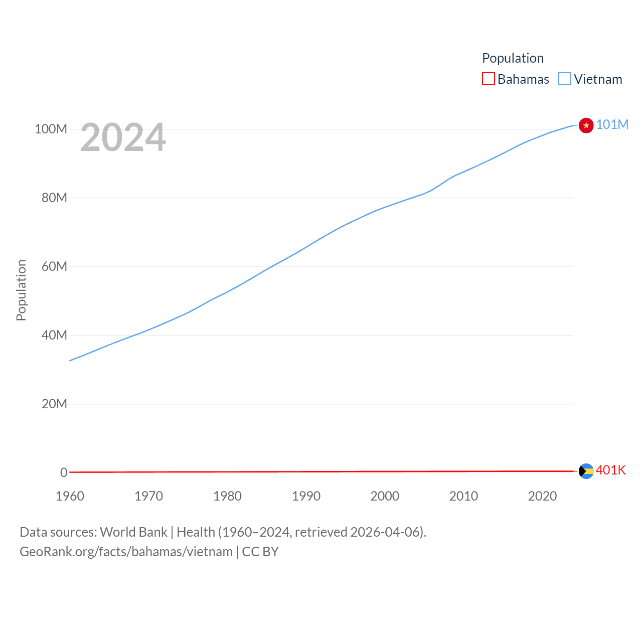 The Bahamas has a population of 401K (ranked 172/197), compared with 101M in Vietnam (ranked 16/197). The Bahamas' land area is 3,865 sq mi versus 121,016 sq mi for Vietnam (ranked 162nd vs. 67th).