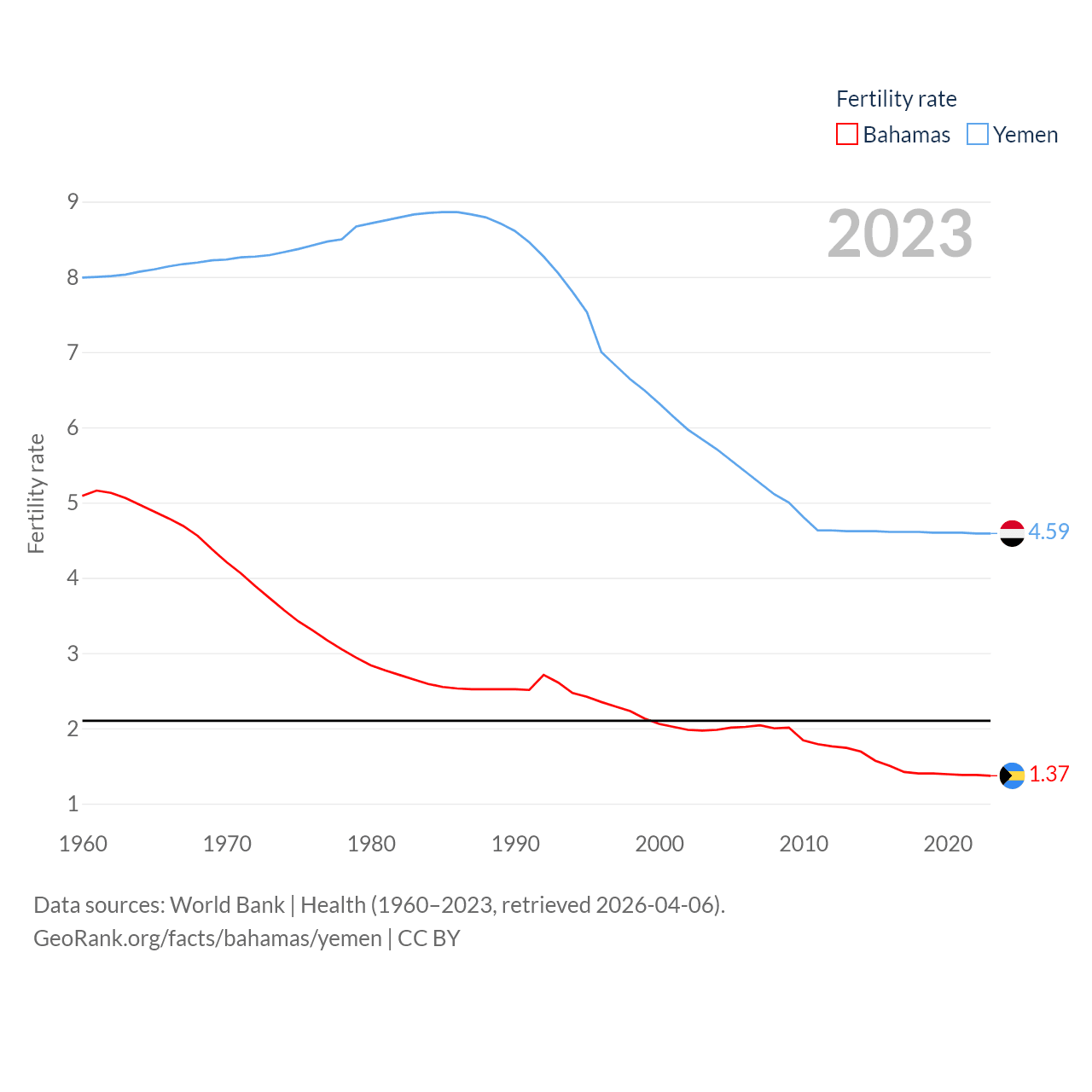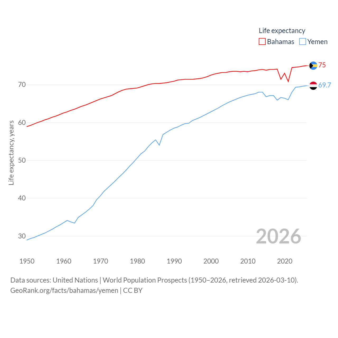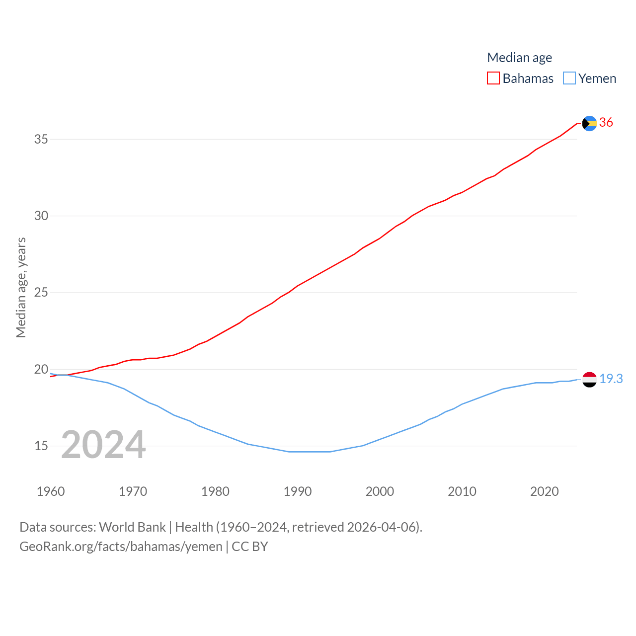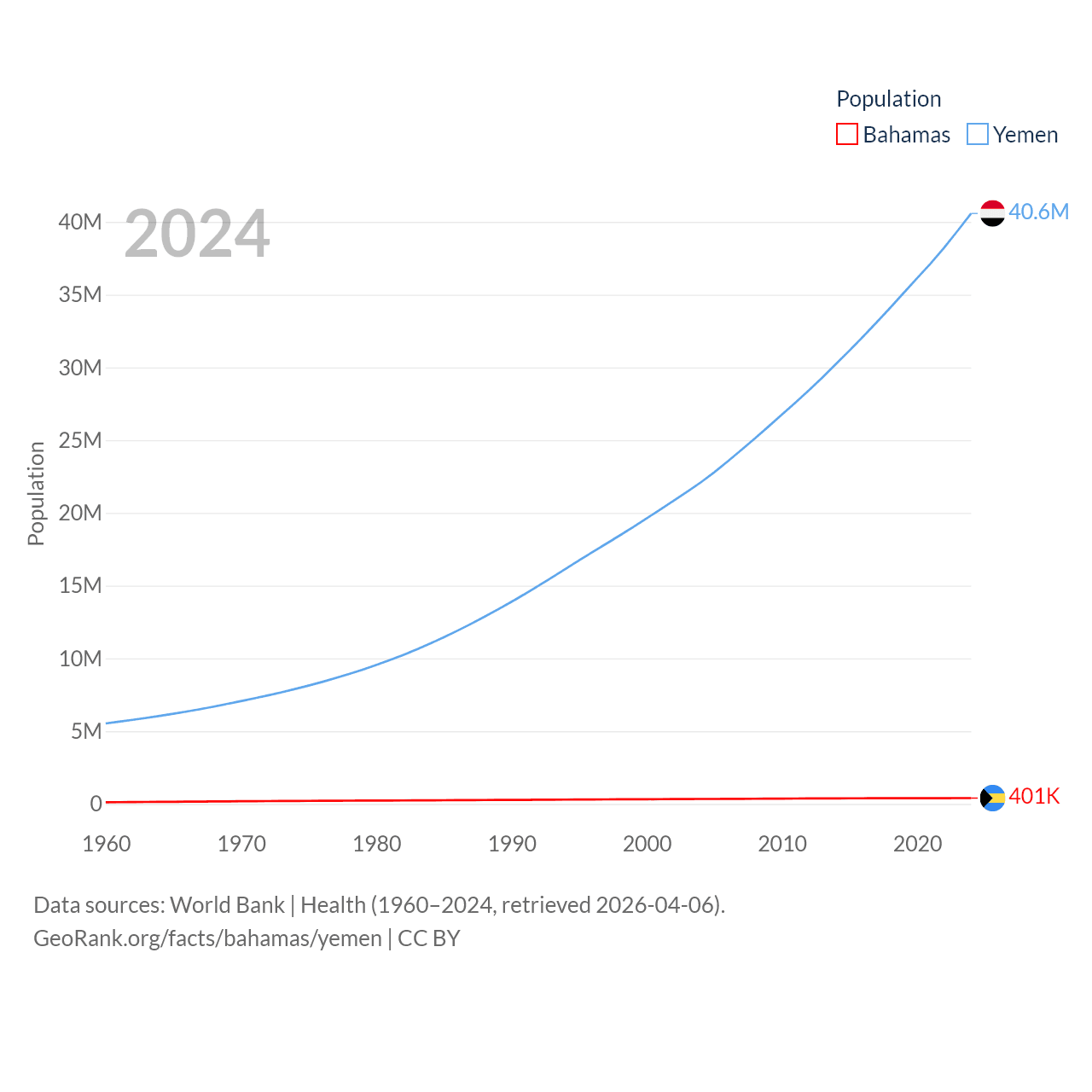 The Bahamas has a population of 401K (ranked 172/197), compared with 40.6M in Yemen (ranked 38/197). The Bahamas' land area is 3,865 sq mi versus 203,850 sq mi for Yemen (ranked 162nd vs. 49th).