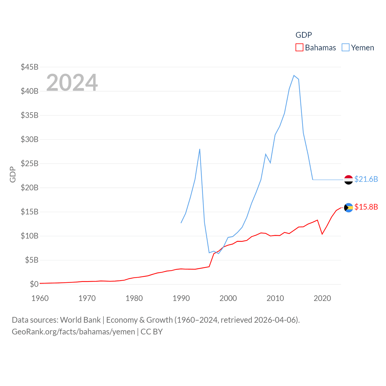By GDP, The Bahamas ranks 140/197 ($15.8B) and Yemen ranks 125/197 ($21.6B). By GDP per capita, The Bahamas ranks 30/197 ($39,455), while Yemen ranks 191/197 ($634).