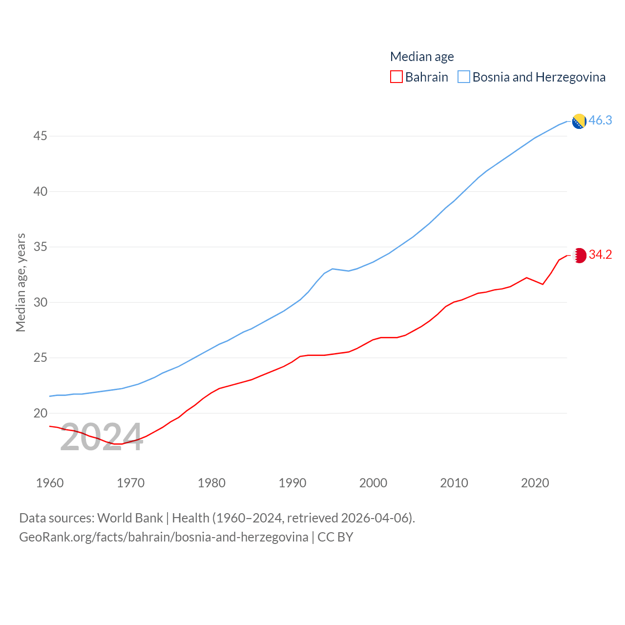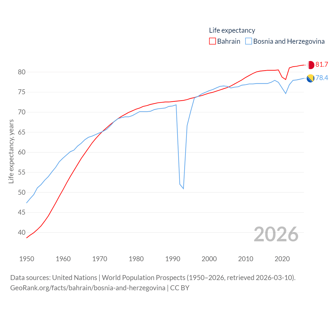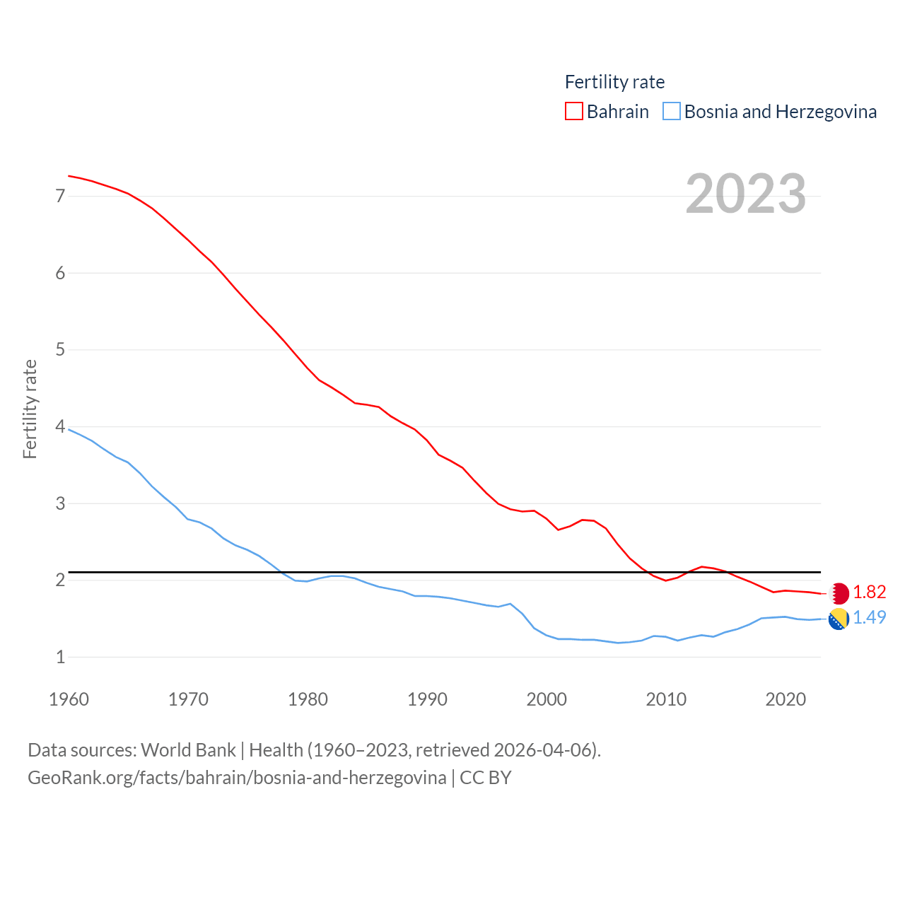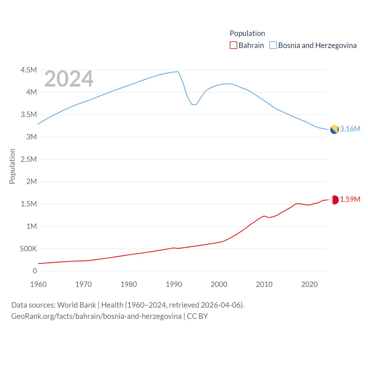 Bahrain has a population of 1.59M (ranked 151/197), compared with 3.16M in Bosnia and Herzegovina (ranked 134/197). Bahrain's land area is 309 sq mi versus 19,768 sq mi for Bosnia and Herzegovina (ranked 174th vs. 125th).