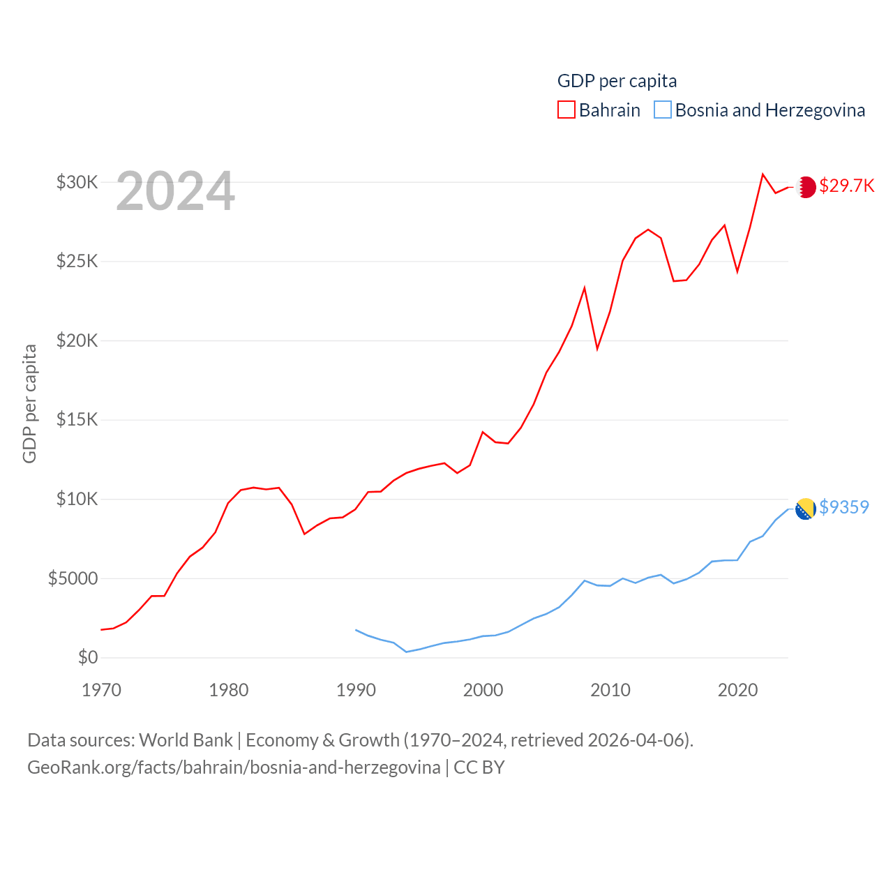 By GDP, Bahrain ranks 96/197 ($47.1B) and Bosnia and Herzegovina ranks 111/197 ($29.6B). By GDP per capita, Bahrain ranks 42/197 ($29,654), while Bosnia and Herzegovina ranks 87/197 ($9,359).