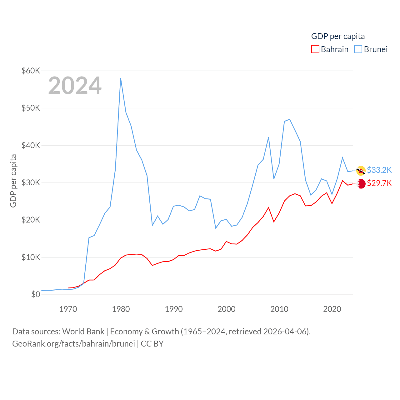 By GDP, Bahrain ranks 96/197 ($47.1B) and Brunei ranks 142/197 ($15.3B). By GDP per capita, Bahrain ranks 42/197 ($29,654), while Brunei ranks 36/197 ($33,153).