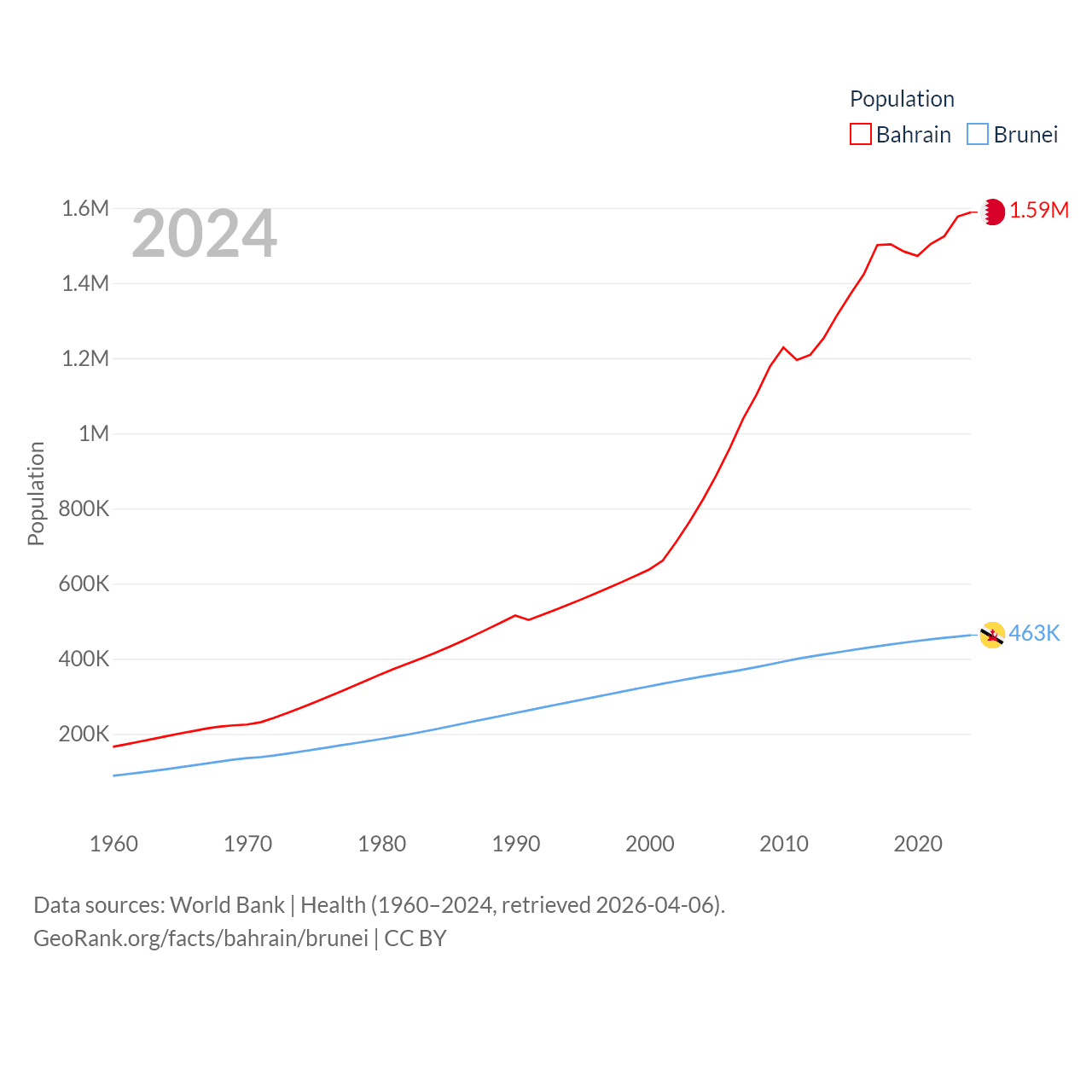 Bahrain has a population of 1.59M (ranked 151/197), compared with 463K in Brunei (ranked 170/197). Bahrain's land area is 309 sq mi versus 2,035 sq mi for Brunei (ranked 174th vs. 165th).