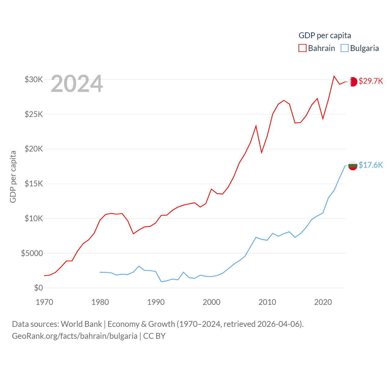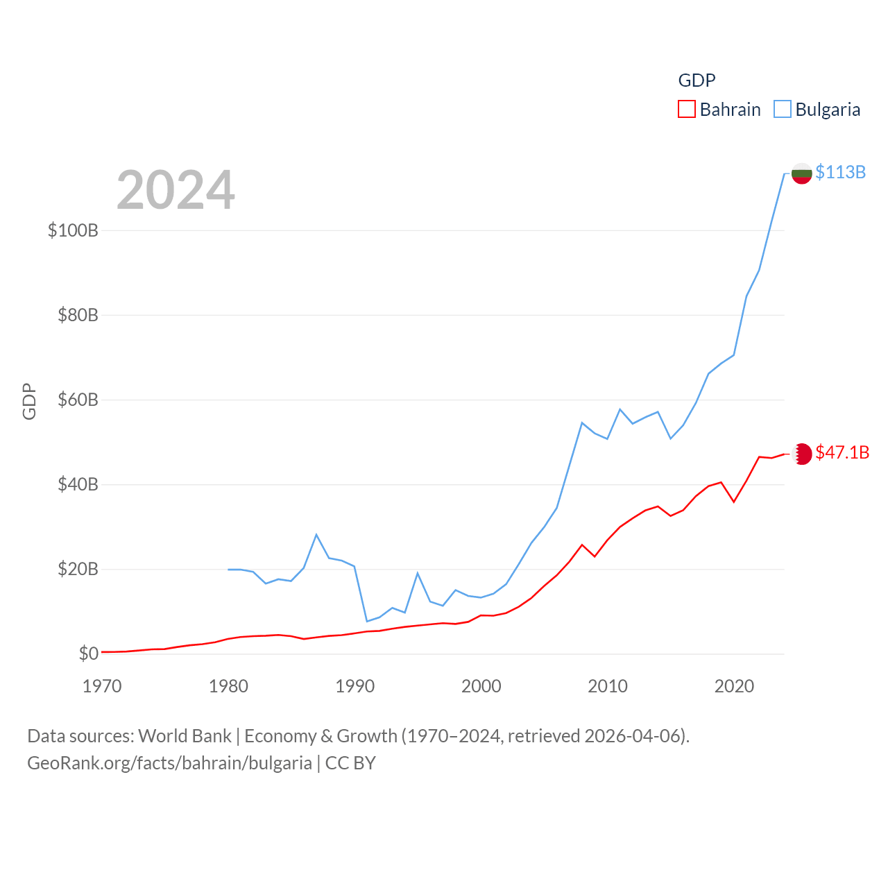 By GDP, Bahrain ranks 96/197 ($47.1B) and Bulgaria ranks 67/197 ($113B). By GDP per capita, Bahrain ranks 42/197 ($29,654), while Bulgaria ranks 64/197 ($17,596).