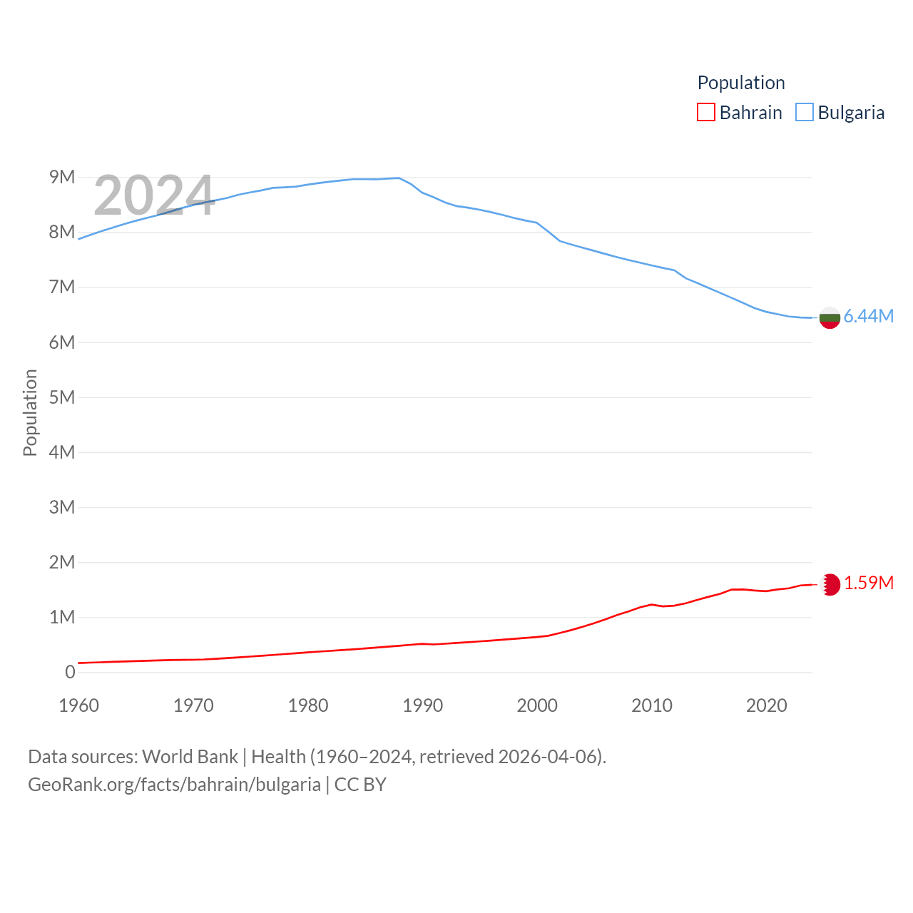 Bahrain has a population of 1.59M (ranked 151/197), compared with 6.44M in Bulgaria (ranked 110/197). Bahrain's land area is 309 sq mi versus 41,915 sq mi for Bulgaria (ranked 174th vs. 101st).