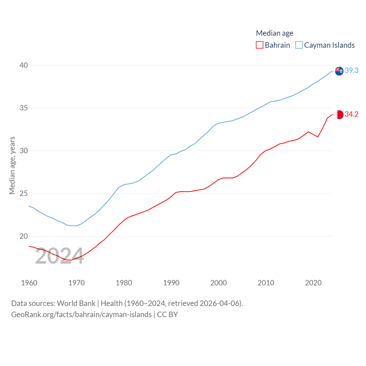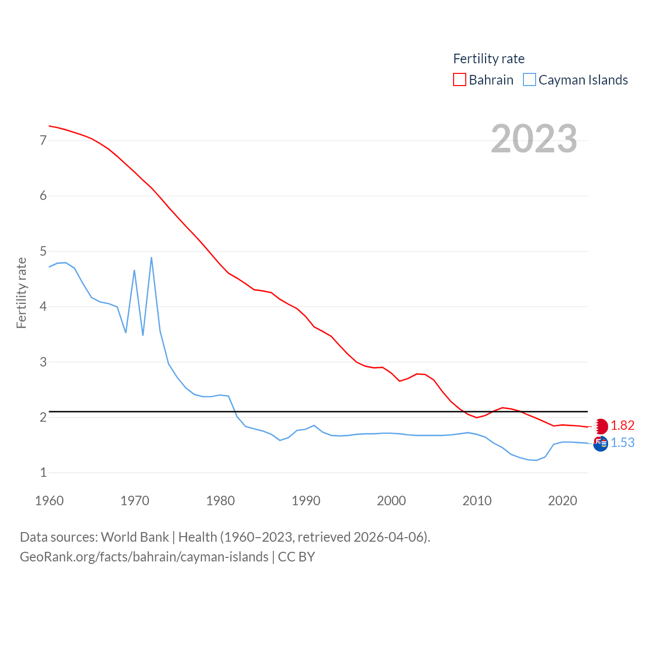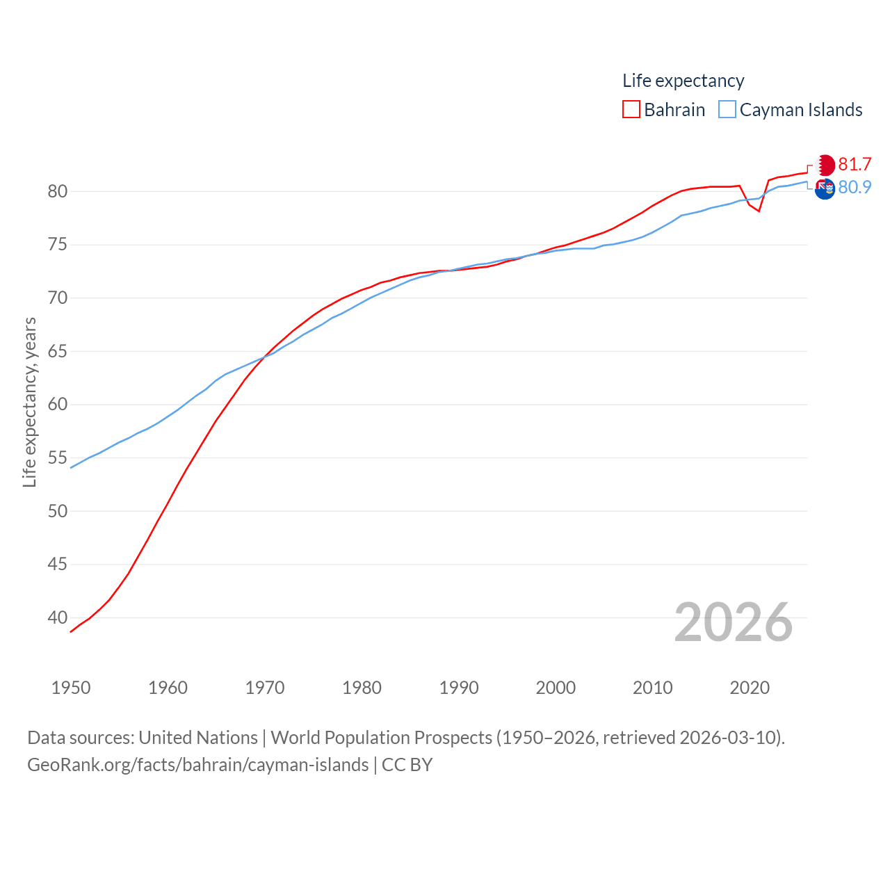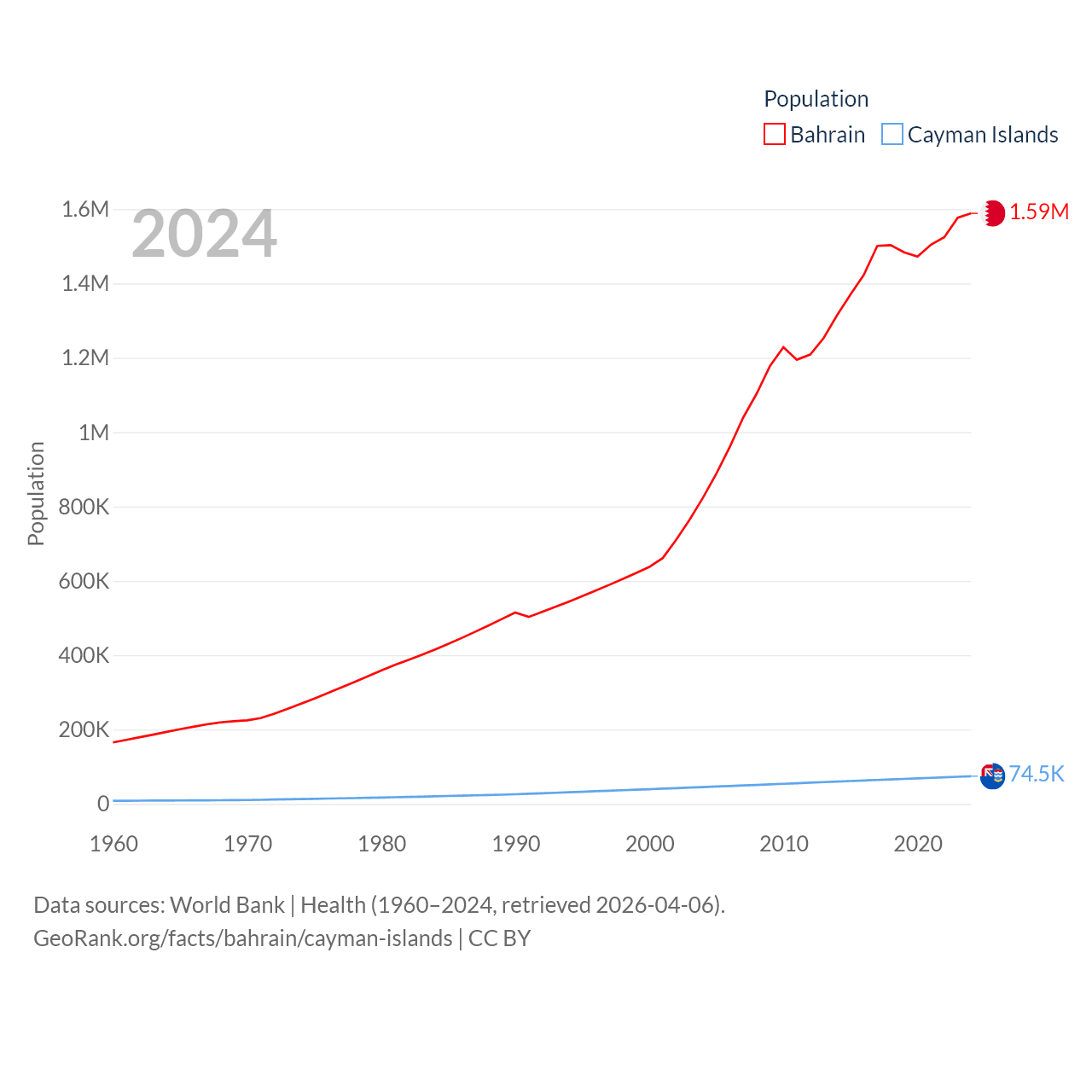 Bahrain has a population of 1.59M (ranked 151/197), compared with 74.5K in The Cayman Islands (ranked 187/197). Bahrain's land area is 309 sq mi versus 92.7 sq mi for The Cayman Islands (ranked 174th vs. 190th).