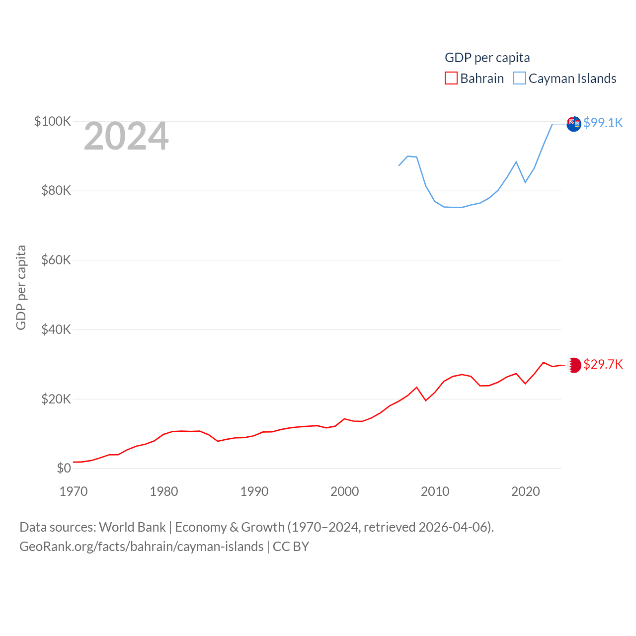 By GDP, Bahrain ranks 96/197 ($47.1B) and The Cayman Islands ranks 158/197 ($7.24B). By GDP per capita, Bahrain ranks 42/197 ($29,654), while The Cayman Islands ranks 6/197 ($99,144).