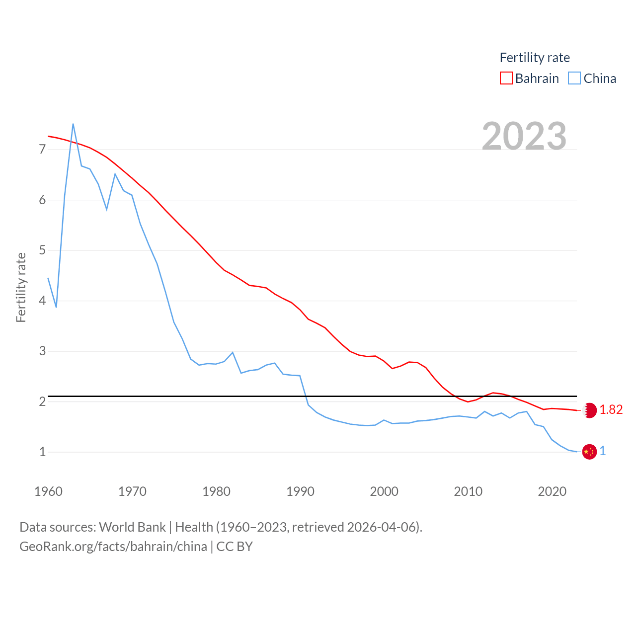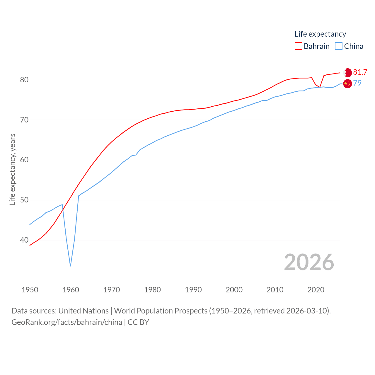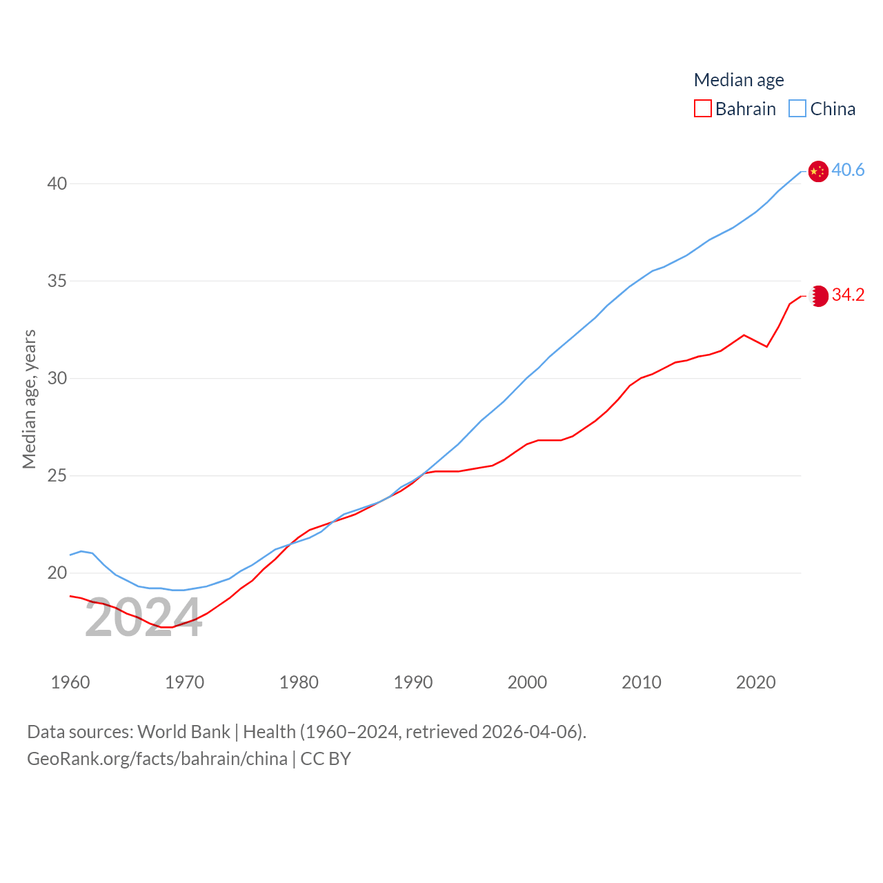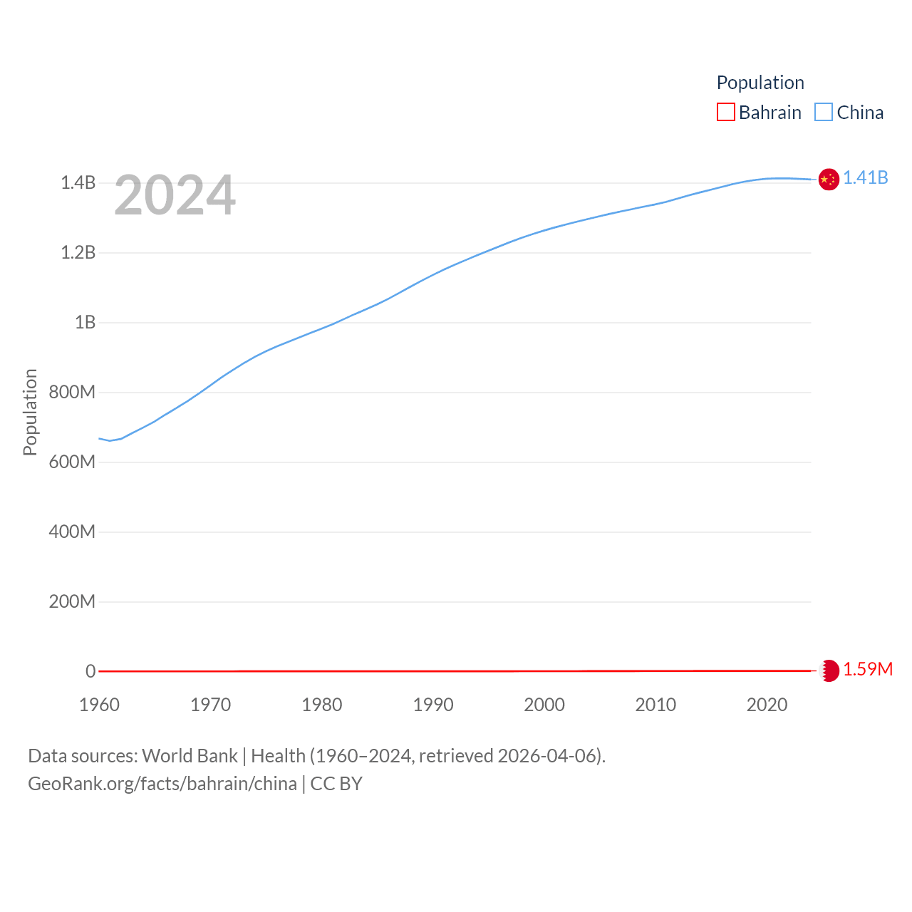 Bahrain has a population of 1.59M (ranked 151/197), compared with 1.41B in China (ranked 2/197). Bahrain's land area is 309 sq mi versus 3,624,808 sq mi for China (ranked 174th vs. 2nd).