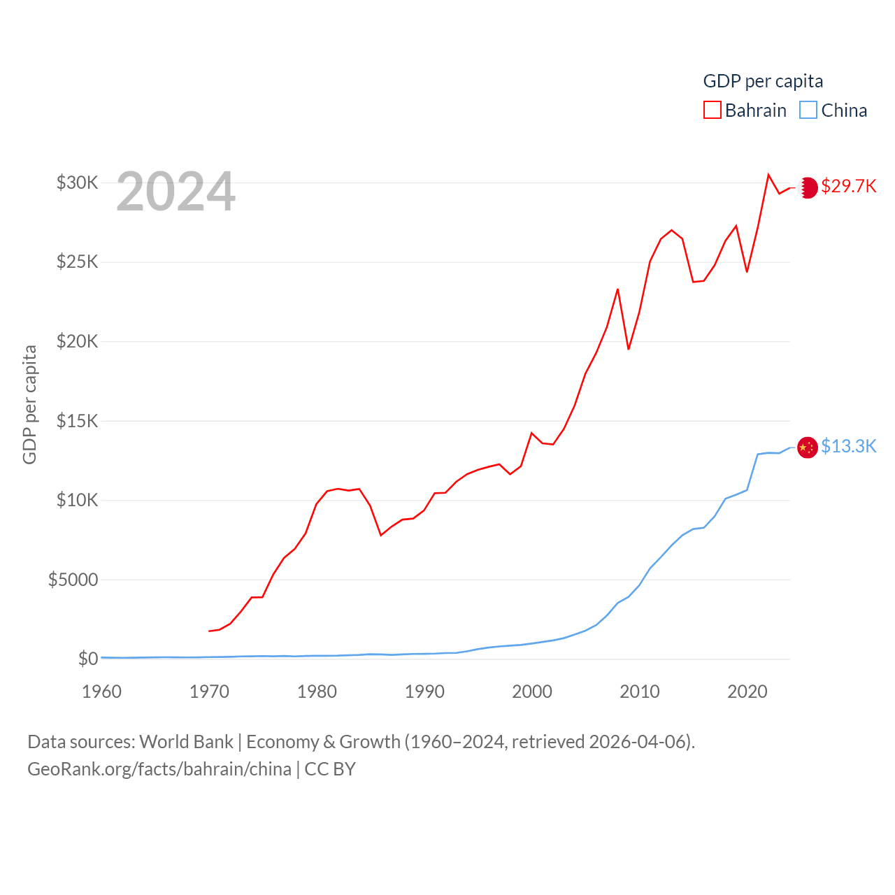 By GDP, Bahrain ranks 96/197 ($47.1B) and China ranks 2/197 ($18.7T). By GDP per capita, Bahrain ranks 42/197 ($29,654), while China ranks 76/197 ($13,303).