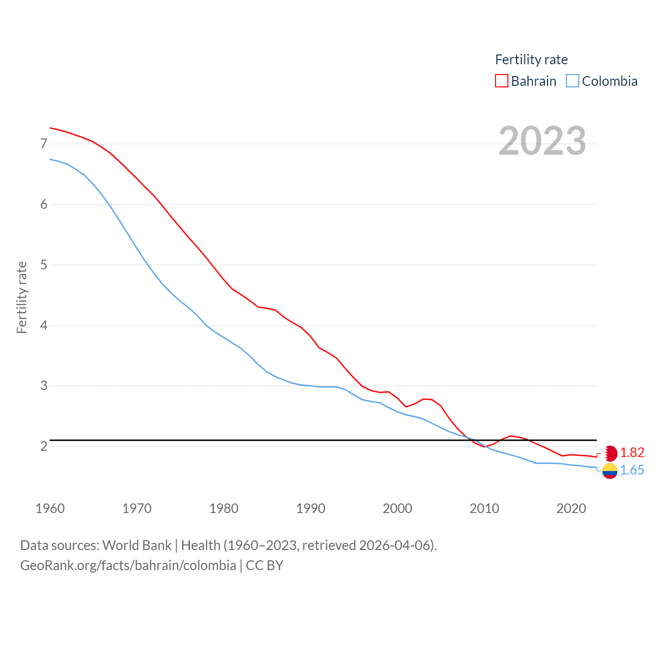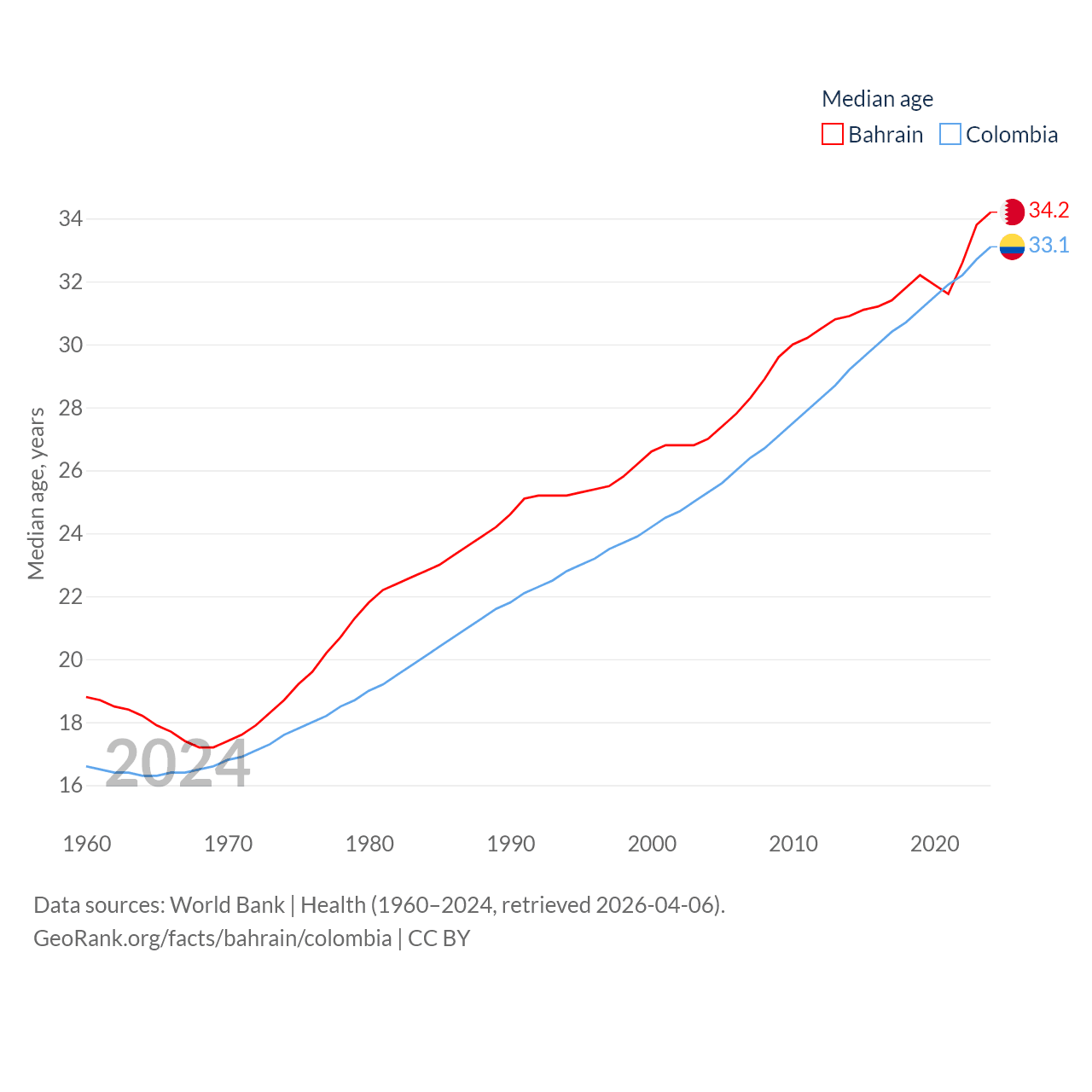 Bahrain has a population of 1.59M (ranked 151/197), compared with 52.9M in Colombia (ranked 28/197). Bahrain's land area is 309 sq mi versus 428,380 sq mi for Colombia (ranked 174th vs. 26th).