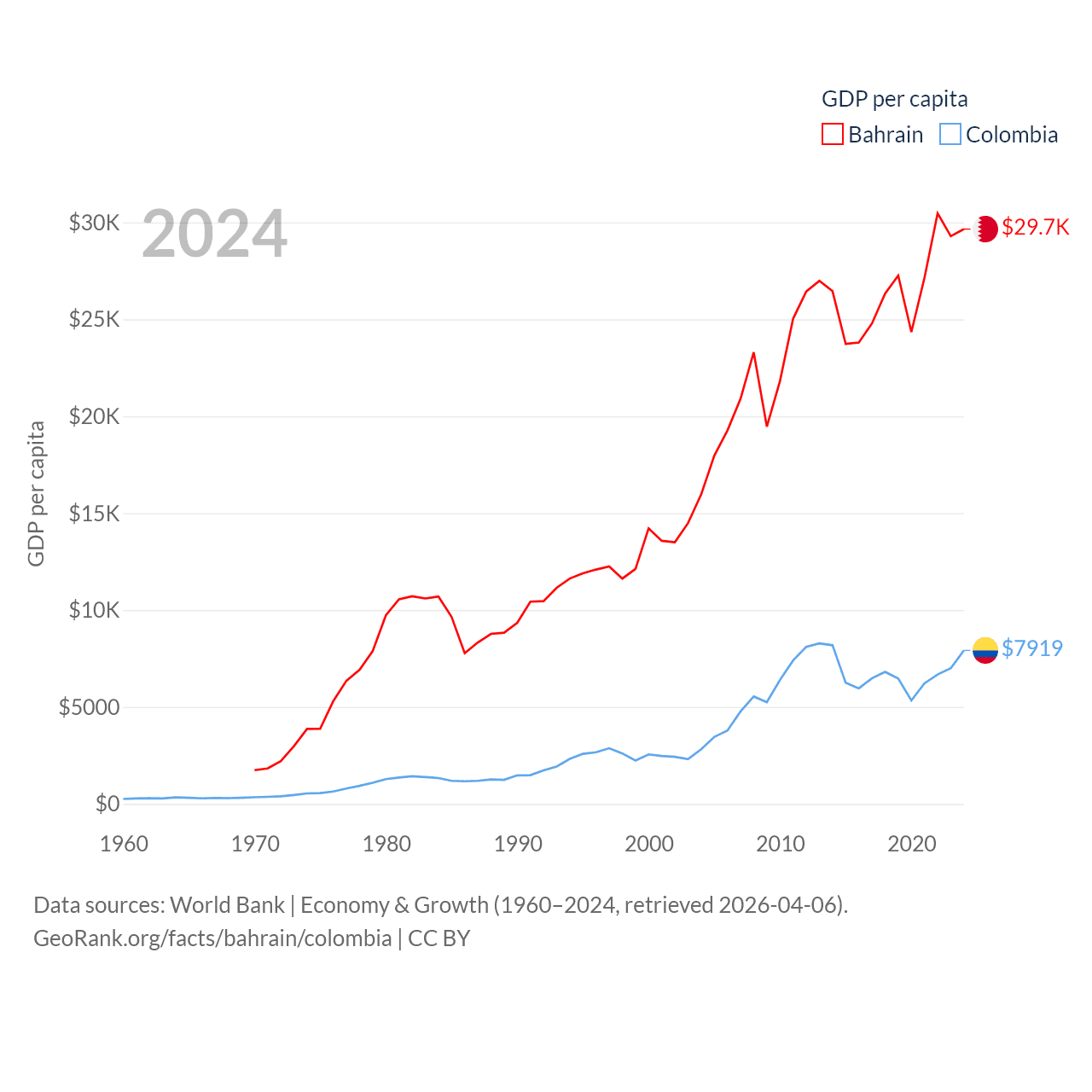 By GDP, Bahrain ranks 96/197 ($47.1B) and Colombia ranks 39/197 ($419B). By GDP per capita, Bahrain ranks 42/197 ($29,654), while Colombia ranks 94/197 ($7,919).