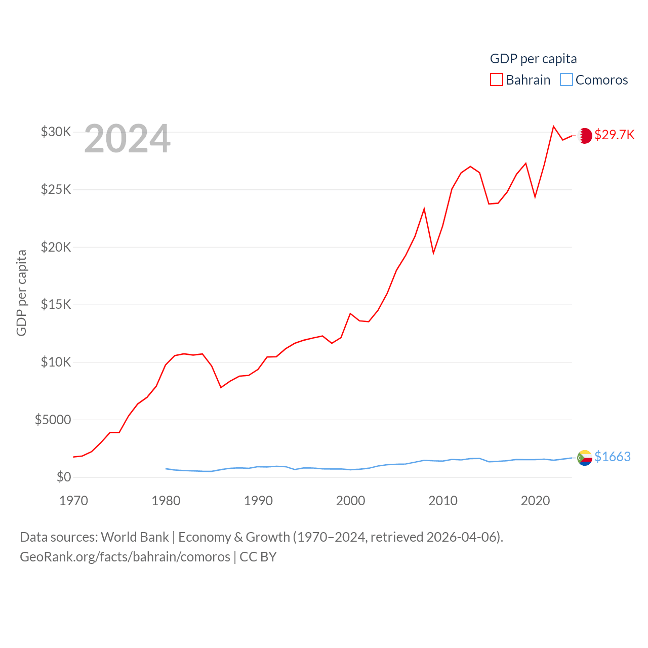 By GDP, Bahrain ranks 96/197 ($47.1B) and Comoros ranks 183/197 ($1.44B). By GDP per capita, Bahrain ranks 42/197 ($29,654), while Comoros ranks 161/197 ($1,663).