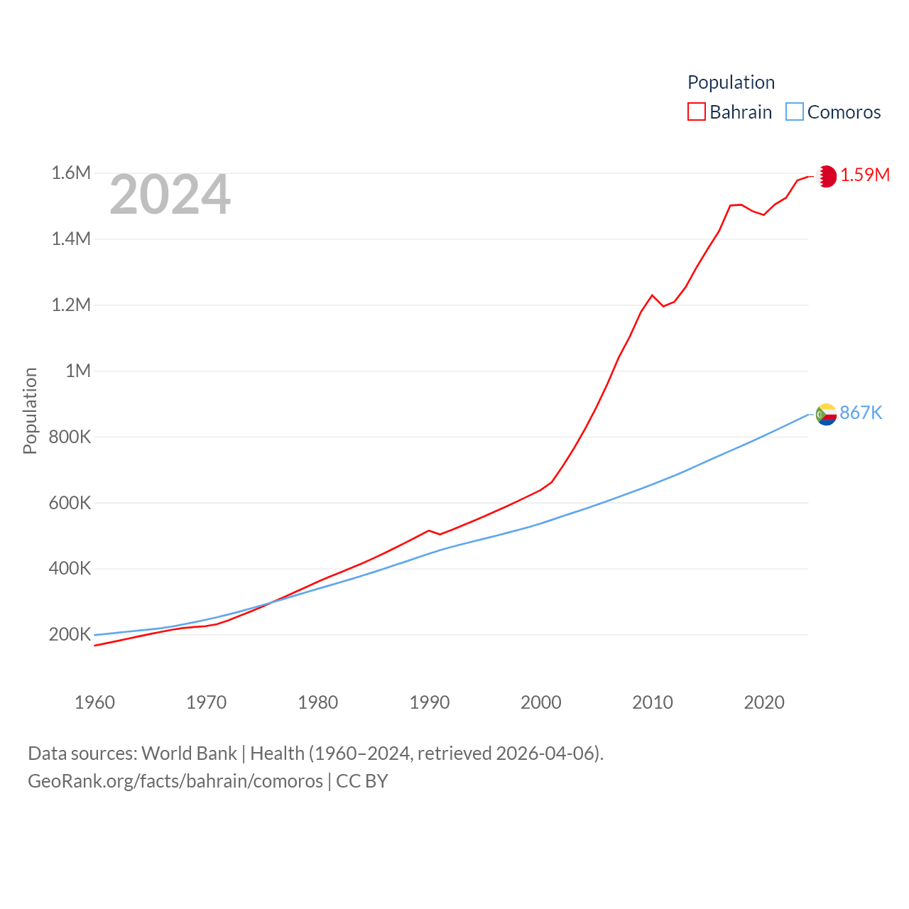 Bahrain has a population of 1.59M (ranked 151/197), compared with 867K in Comoros (ranked 160/197). Bahrain's land area is 309 sq mi versus 719 sq mi for Comoros (ranked 174th vs. 171st).