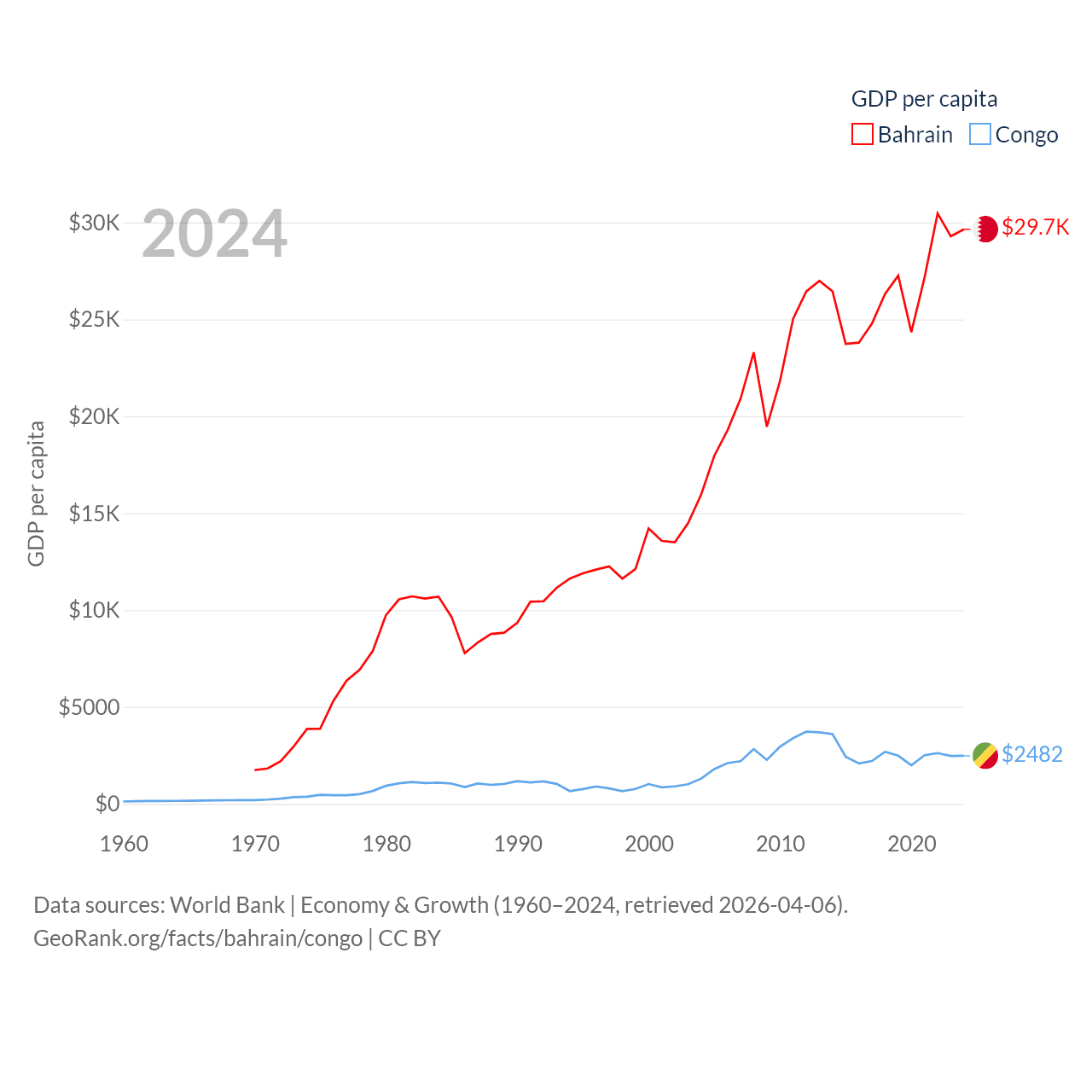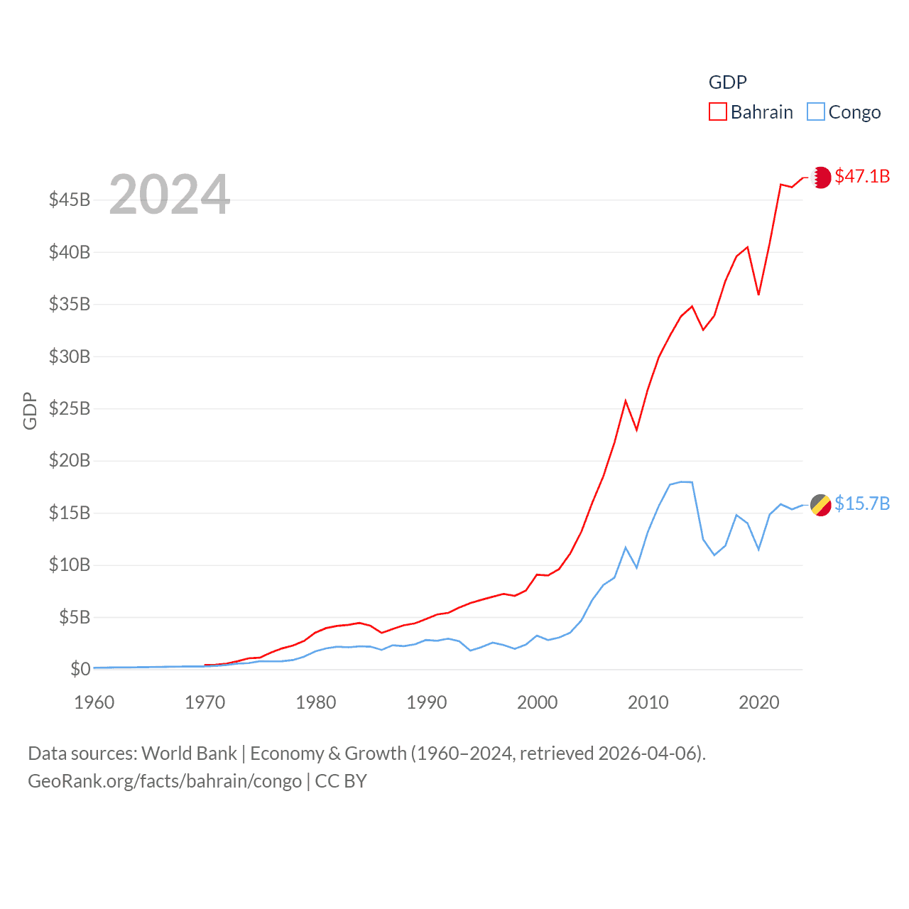 By GDP, Bahrain ranks 96/197 ($47.1B) and The Congo ranks 141/197 ($15.7B). By GDP per capita, Bahrain ranks 42/197 ($29,654), while The Congo ranks 149/197 ($2,482).