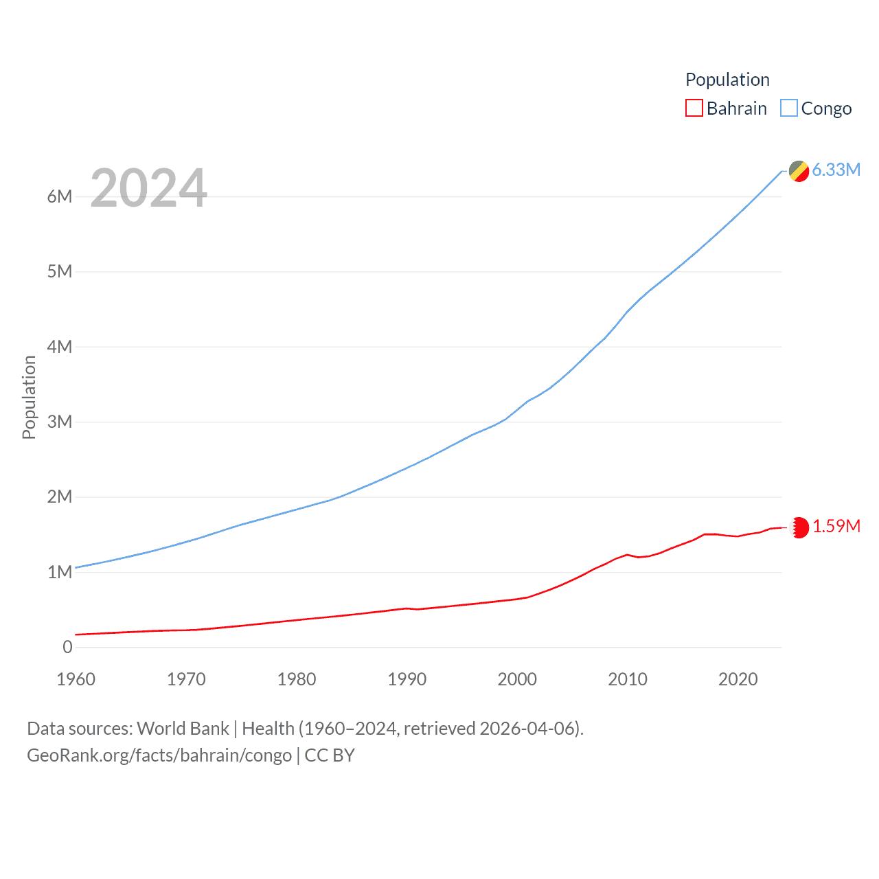 Bahrain has a population of 1.59M (ranked 151/197), compared with 6.33M in The Congo (ranked 112/197). Bahrain's land area is 309 sq mi versus 131,854 sq mi for The Congo (ranked 174th vs. 64th).