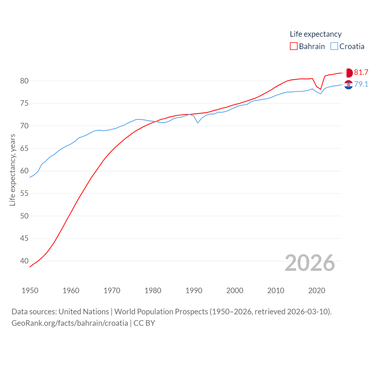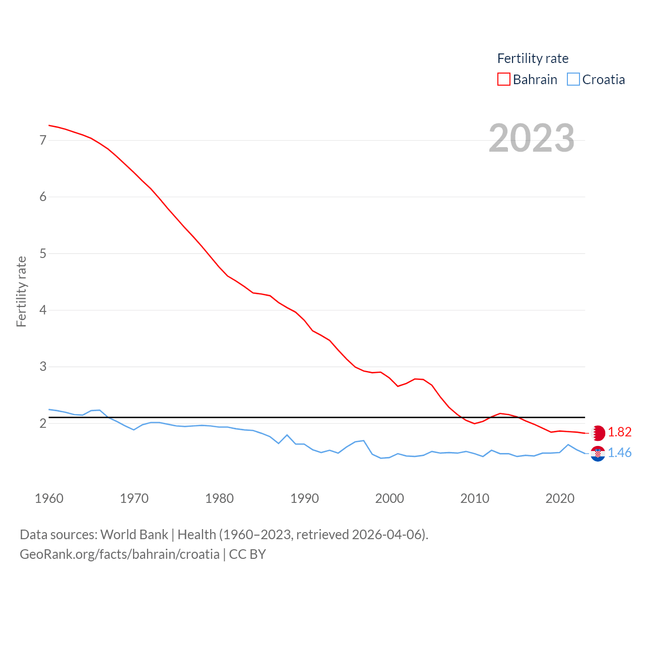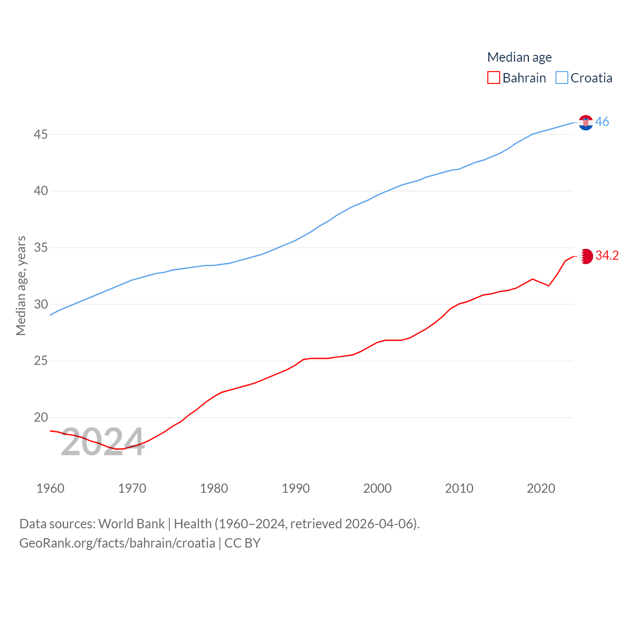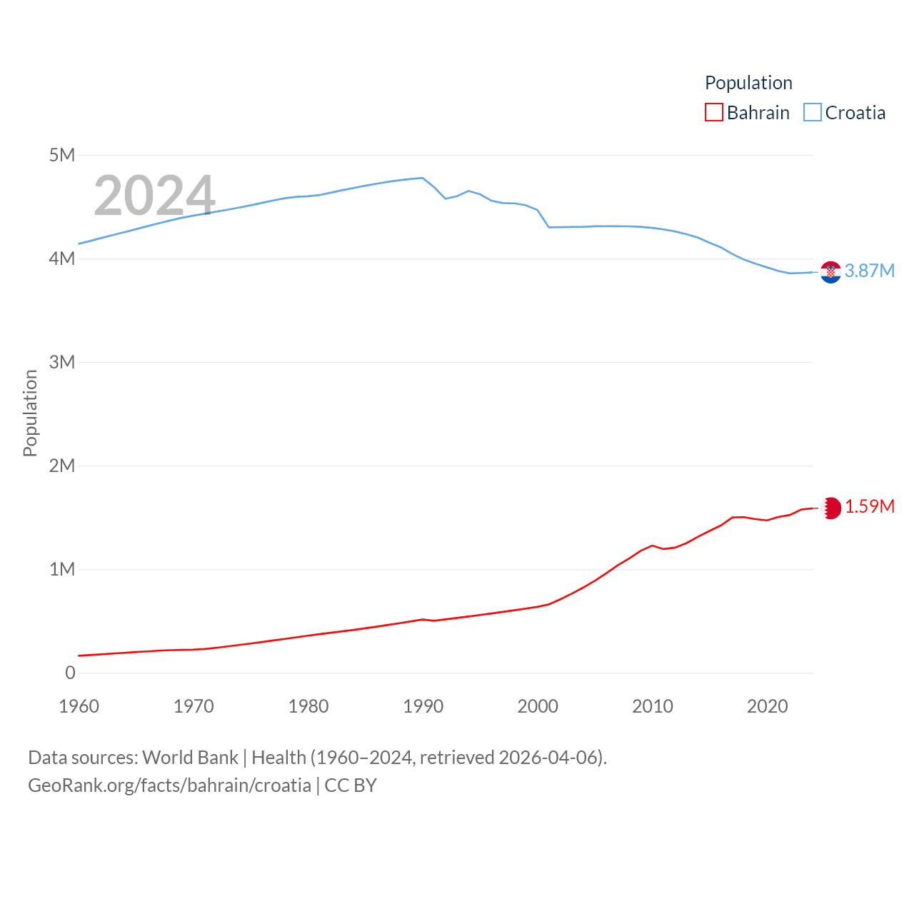 Bahrain has a population of 1.59M (ranked 151/197), compared with 3.87M in Croatia (ranked 129/197). Bahrain's land area is 309 sq mi versus 21,606 sq mi for Croatia (ranked 174th vs. 123rd).