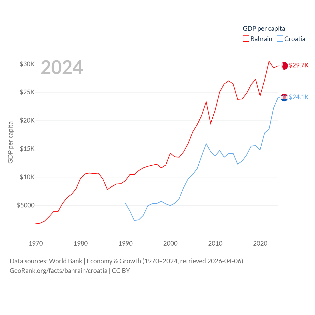 By GDP, Bahrain ranks 96/197 ($47.1B) and Croatia ranks 75/197 ($93B). By GDP per capita, Bahrain ranks 42/197 ($29,654), while Croatia ranks 50/197 ($24,050).