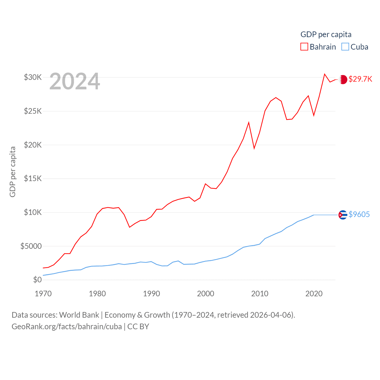 By GDP, Bahrain ranks 96/197 ($47.1B) and Cuba ranks 69/197 ($107B). By GDP per capita, Bahrain ranks 42/197 ($29,654), while Cuba ranks 86/197 ($9,605).