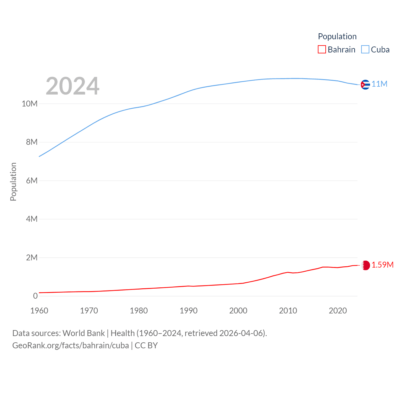Bahrain has a population of 1.59M (ranked 151/197), compared with 11M in Cuba (ranked 87/197). Bahrain's land area is 309 sq mi versus 40,077 sq mi for Cuba (ranked 174th vs. 103rd).