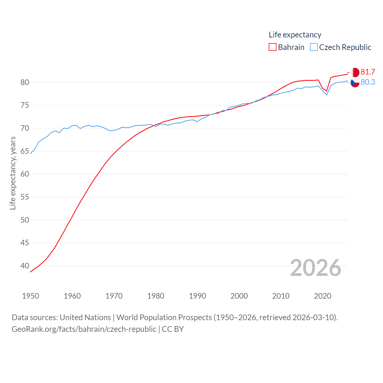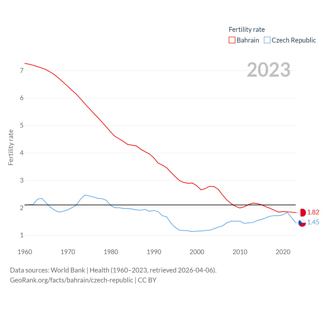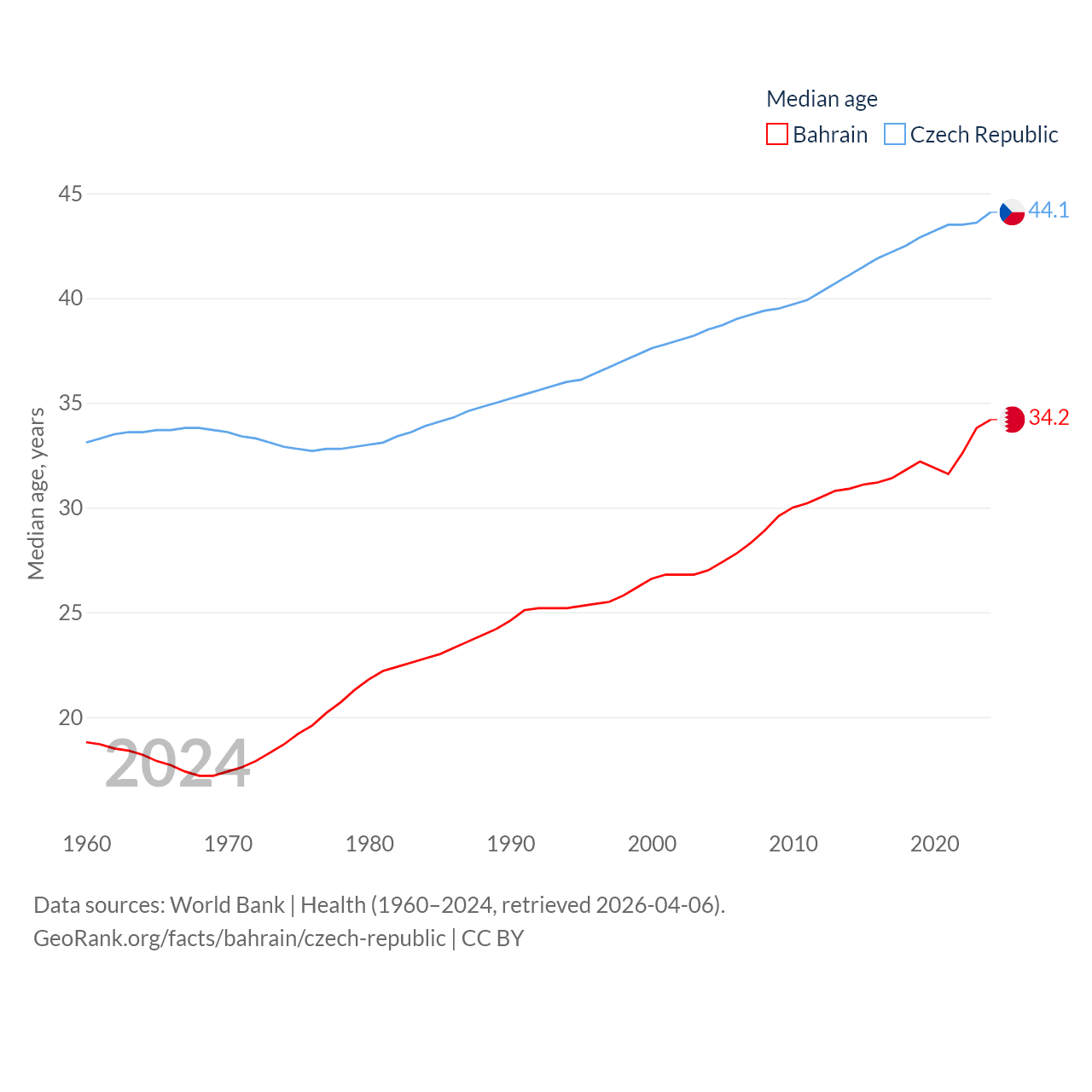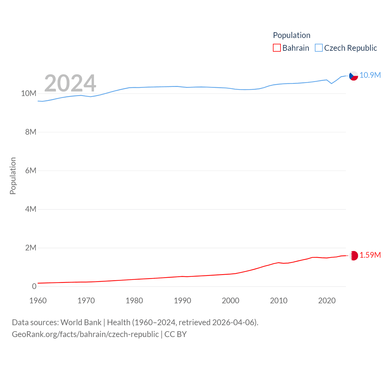 Bahrain has a population of 1.59M (ranked 151/197), compared with 10.9M in The Czech Republic (ranked 88/197). Bahrain's land area is 309 sq mi versus 29,794 sq mi for The Czech Republic (ranked 174th vs. 114th).