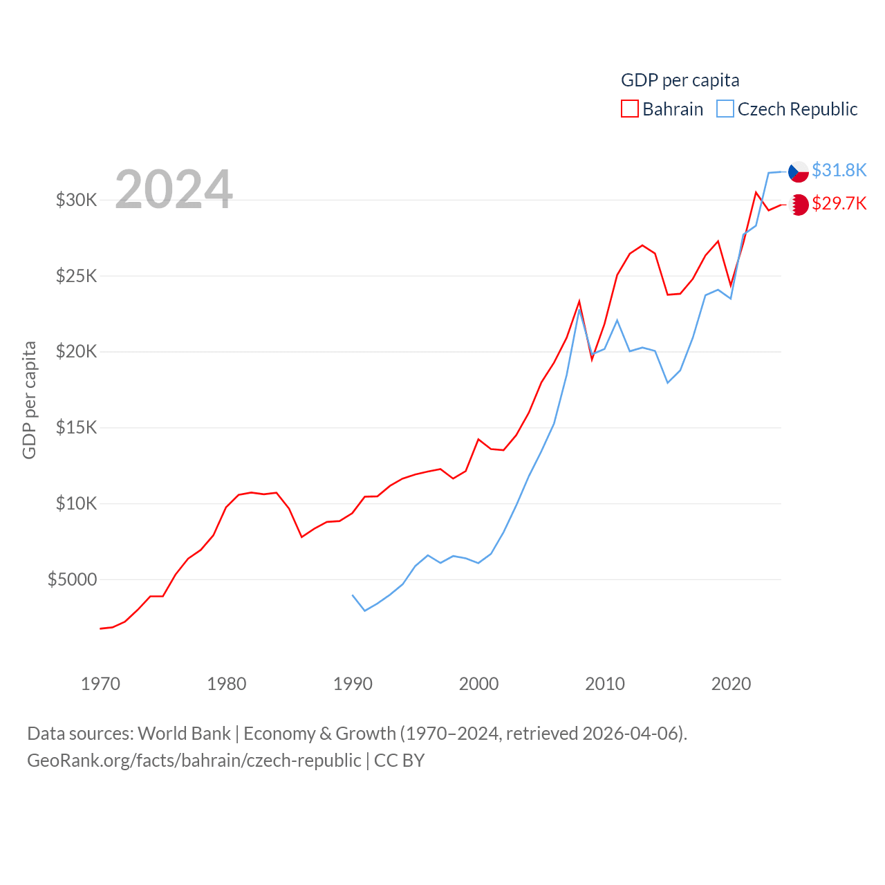 By GDP, Bahrain ranks 96/197 ($47.1B) and The Czech Republic ranks 44/197 ($347B). By GDP per capita, Bahrain ranks 42/197 ($29,654), while The Czech Republic ranks 39/197 ($31,823).