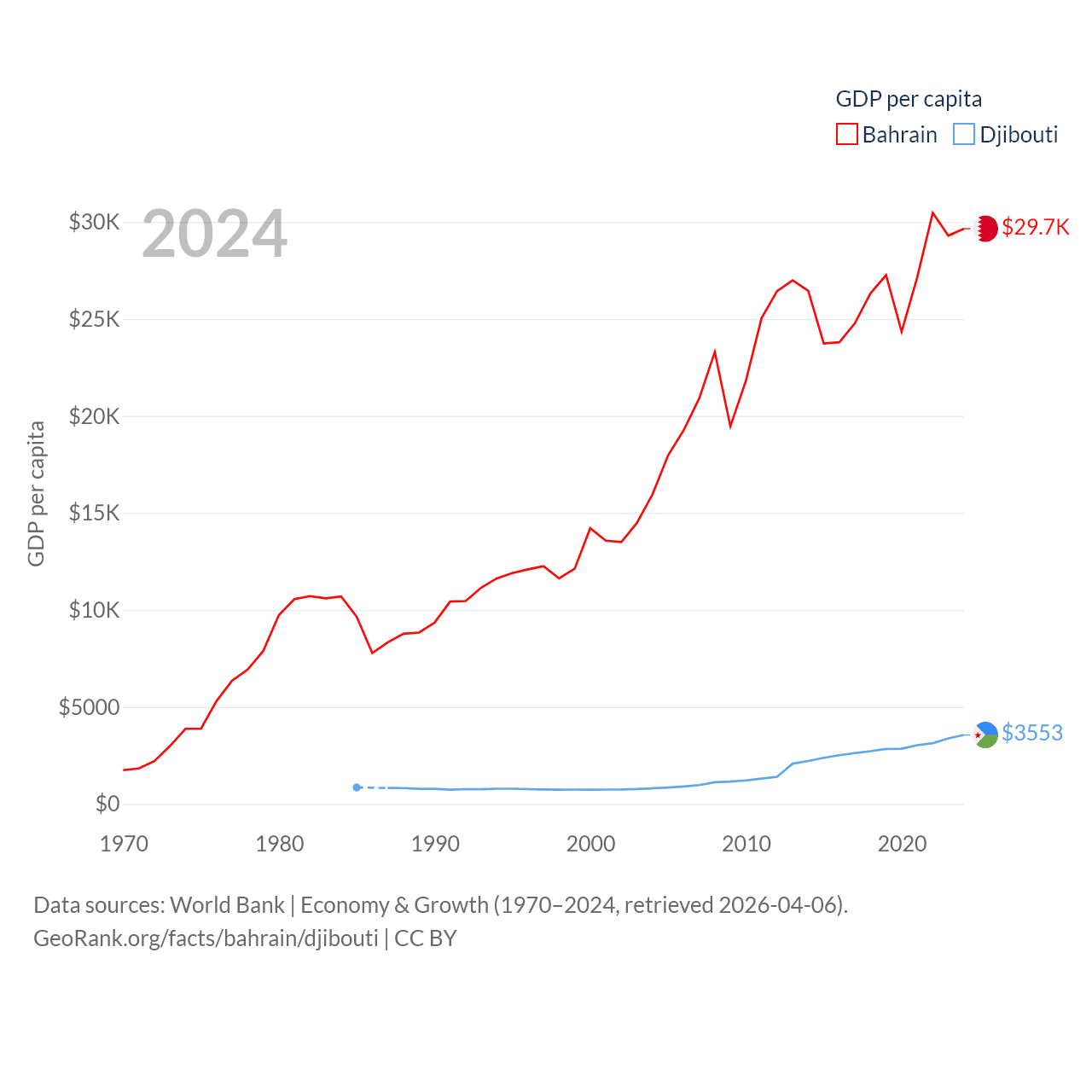 By GDP, Bahrain ranks 96/197 ($47.1B) and Djibouti ranks 165/197 ($4.15B). By GDP per capita, Bahrain ranks 42/197 ($29,654), while Djibouti ranks 133/197 ($3,553).