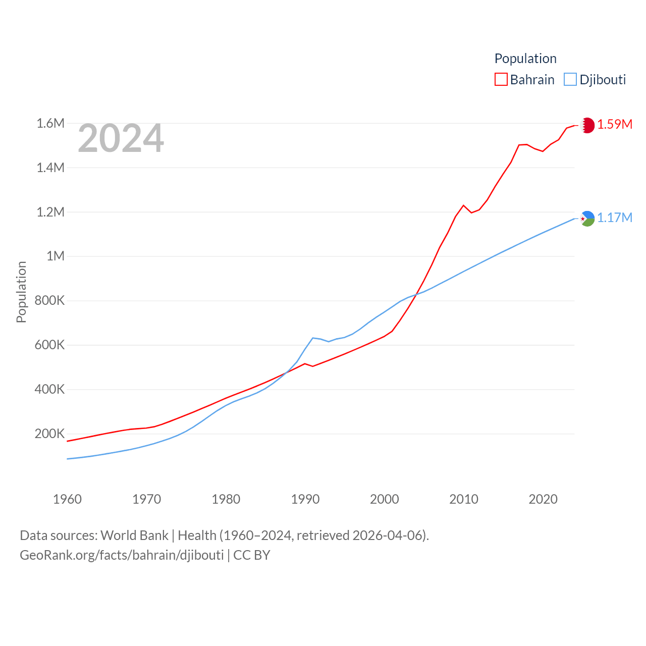 Bahrain has a population of 1.59M (ranked 151/197), compared with 1.17M in Djibouti (ranked 158/197). Bahrain's land area is 309 sq mi versus 8,950 sq mi for Djibouti (ranked 174th vs. 147th).