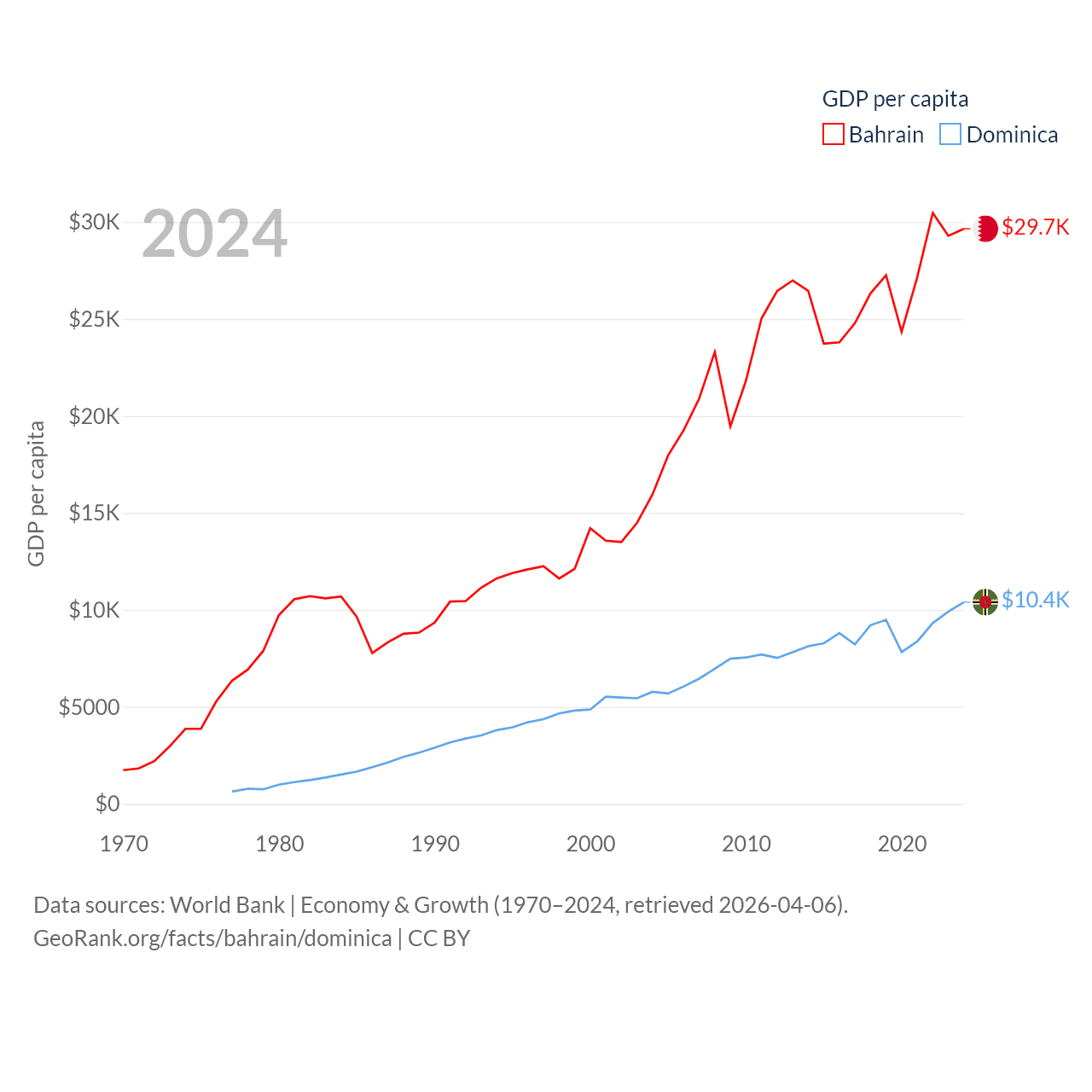 By GDP, Bahrain ranks 96/197 ($47.1B) and Dominica ranks 190/197 ($689M). By GDP per capita, Bahrain ranks 42/197 ($29,654), while Dominica ranks 84/197 ($10,405).