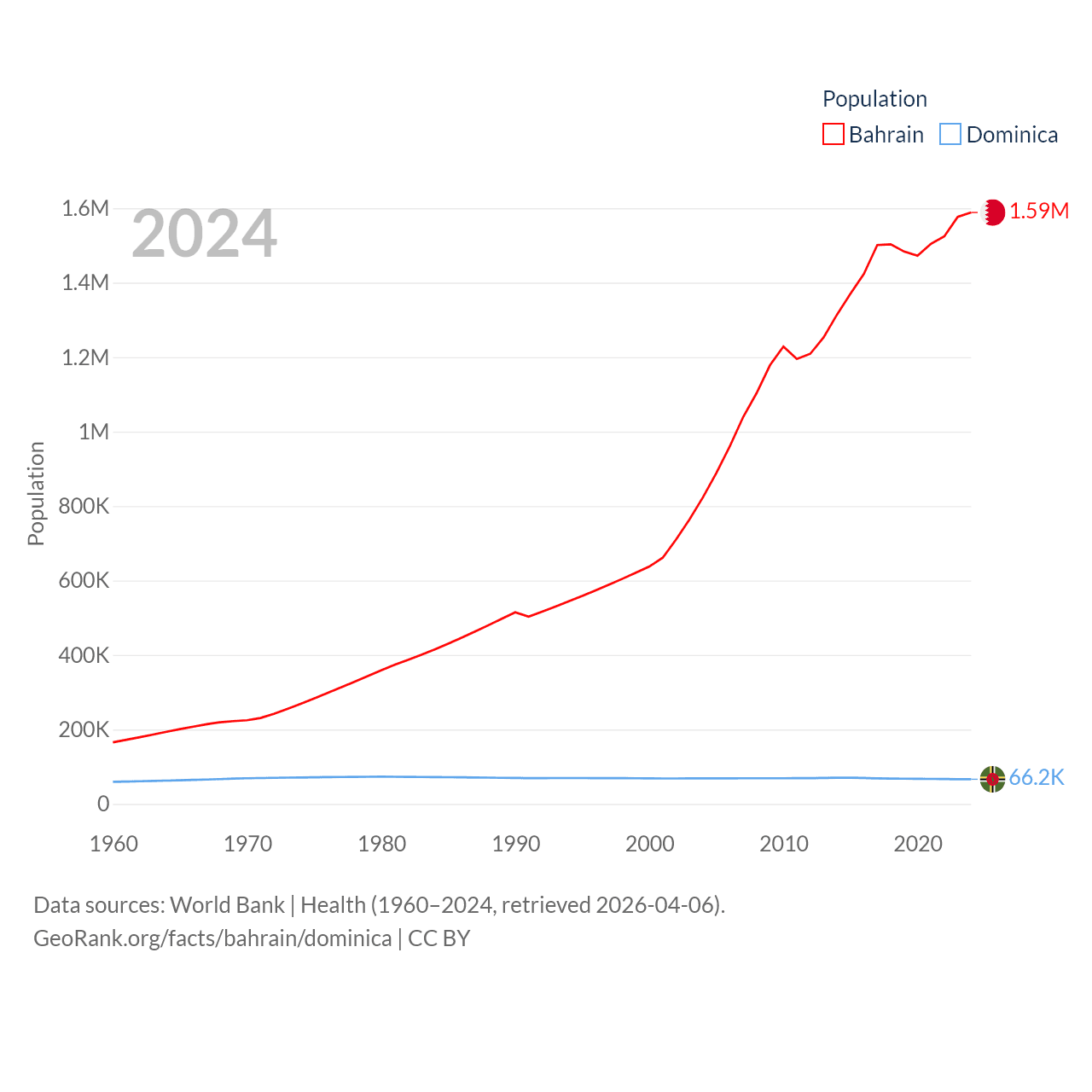 Bahrain has a population of 1.59M (ranked 151/197), compared with 66.2K in Dominica (ranked 188/197). Bahrain's land area is 309 sq mi versus 289.6 sq mi for Dominica (ranked 174th vs. 175th).