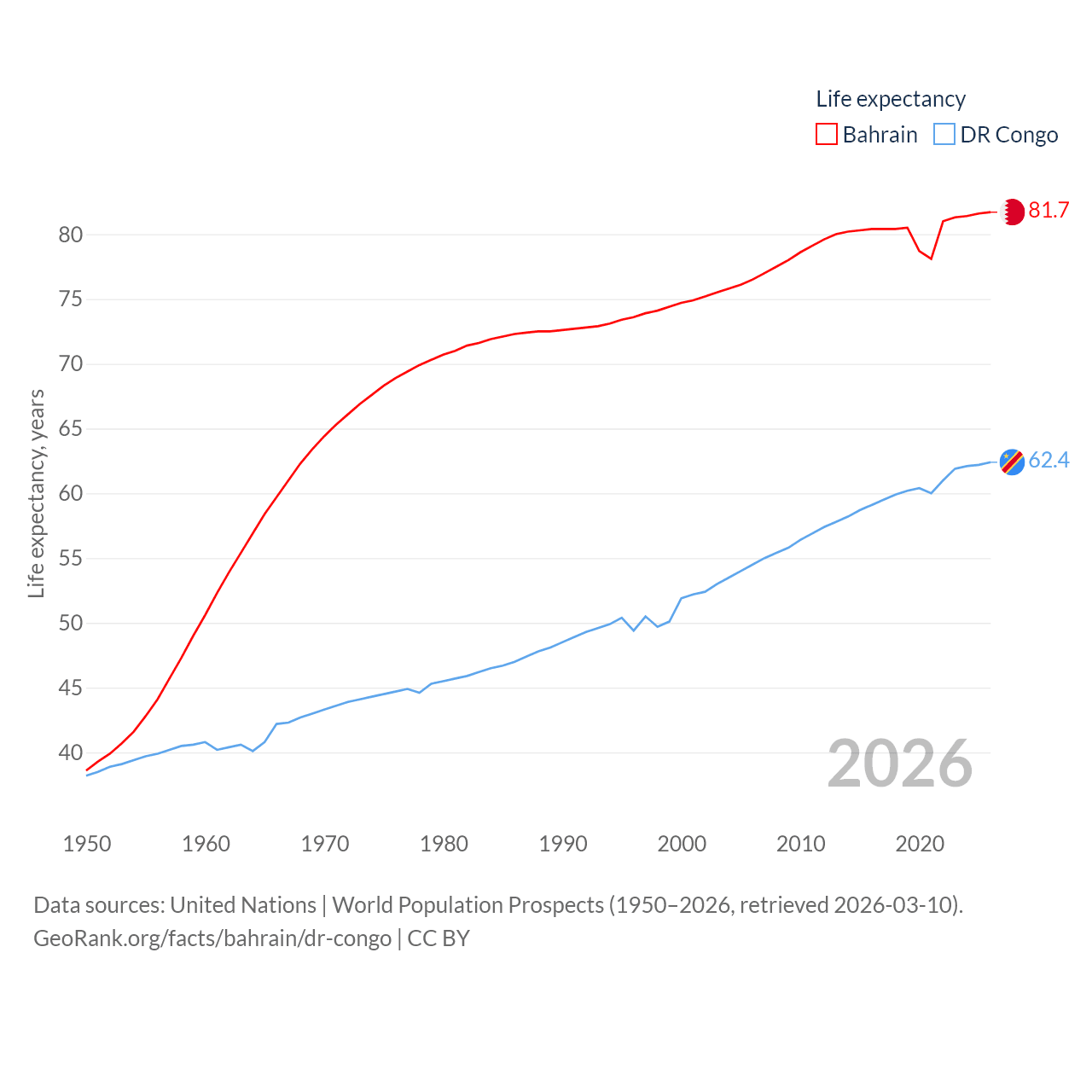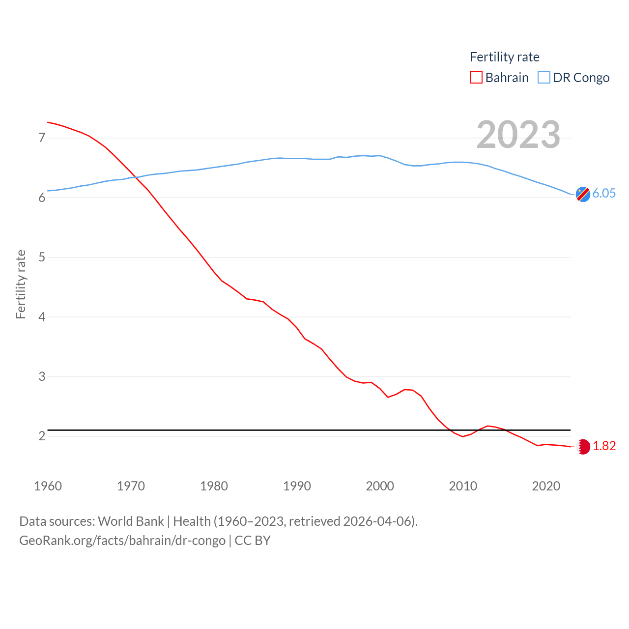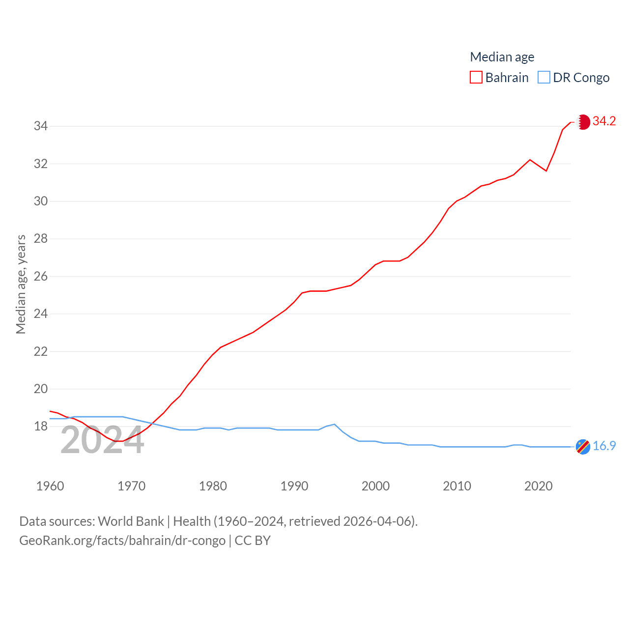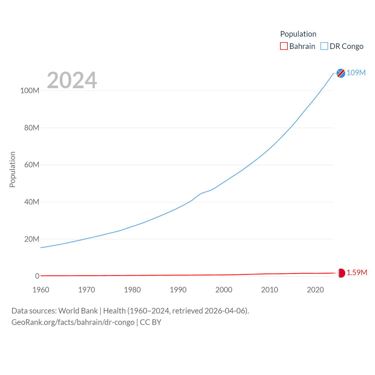 Bahrain has a population of 1.59M (ranked 151/197), compared with 109M in The DR Congo (ranked 15/197). Bahrain's land area is 309 sq mi versus 875,313 sq mi for The DR Congo (ranked 174th vs. 11th).