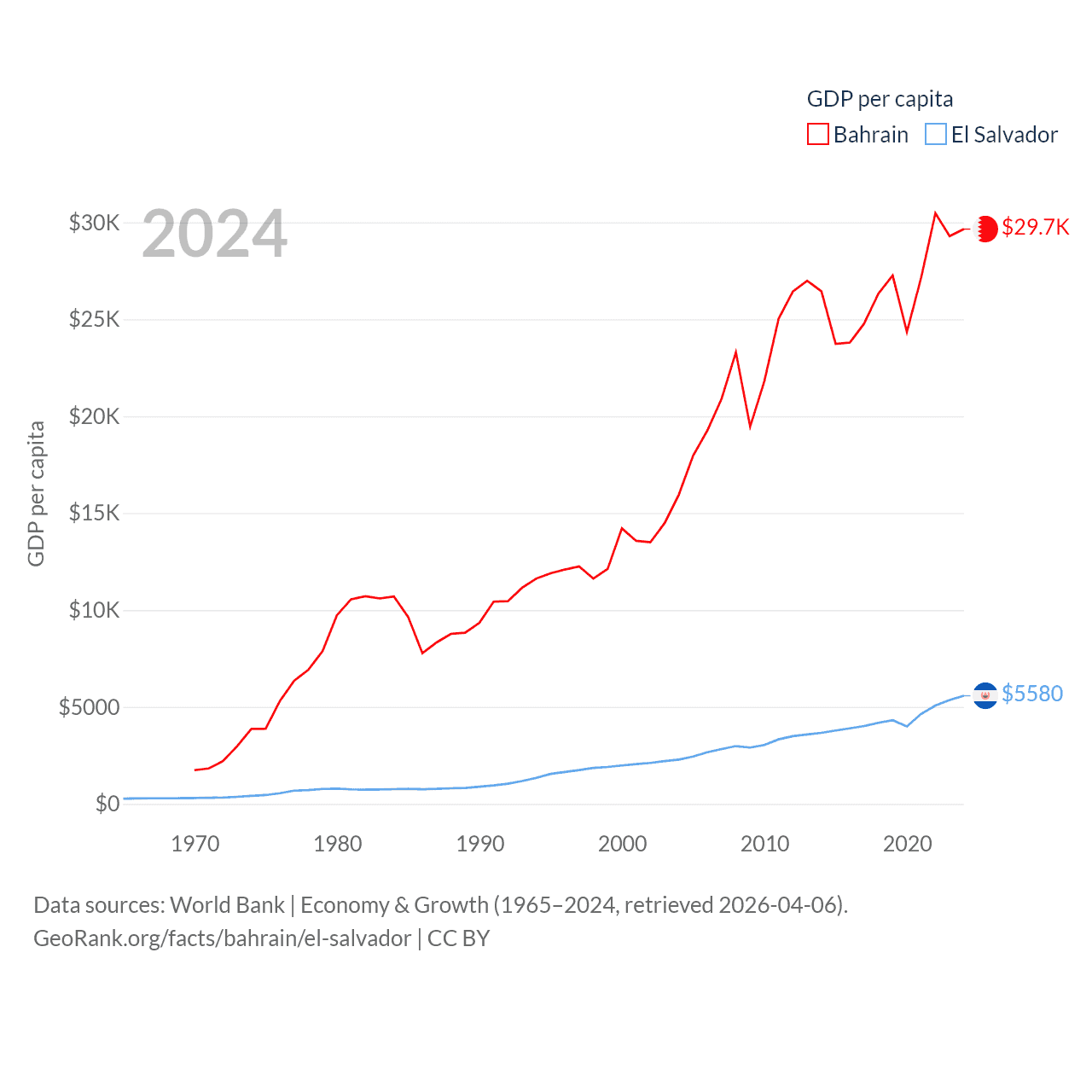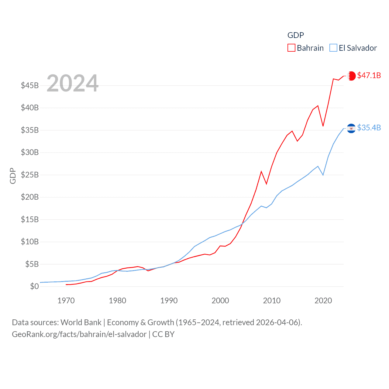 By GDP, Bahrain ranks 96/197 ($47.1B) and El Salvador ranks 105/197 ($35.4B). By GDP per capita, Bahrain ranks 42/197 ($29,654), while El Salvador ranks 116/197 ($5,580).