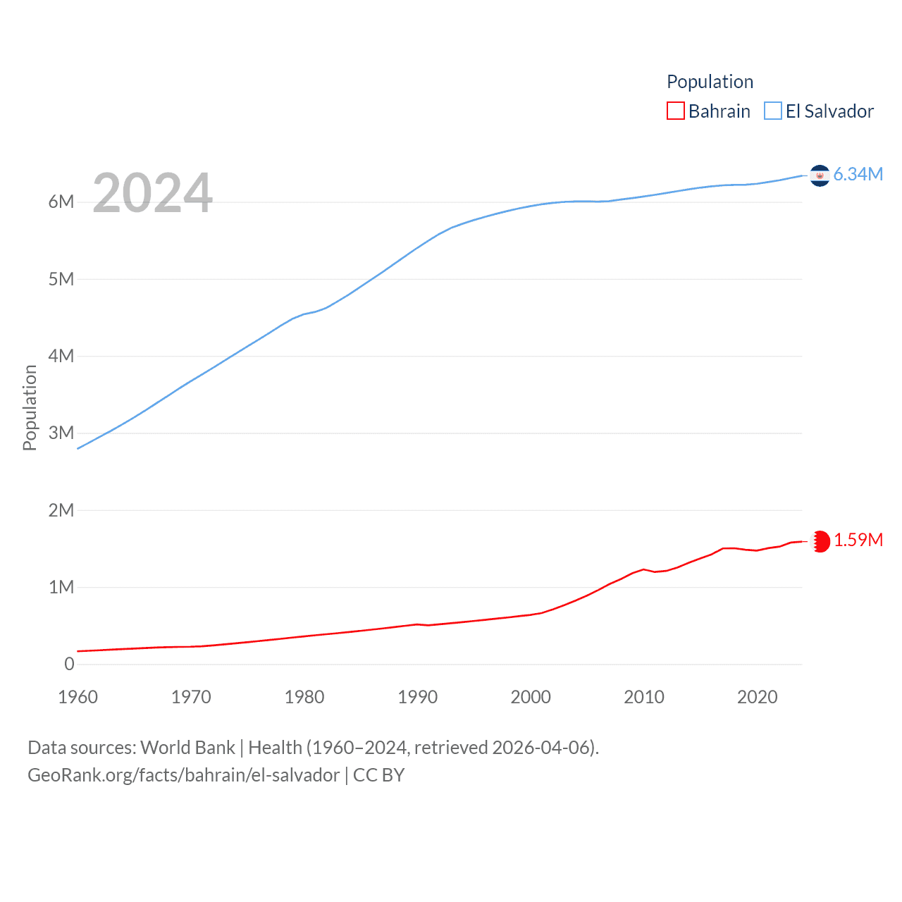 Bahrain has a population of 1.59M (ranked 151/197), compared with 6.34M in El Salvador (ranked 111/197). Bahrain's land area is 309 sq mi versus 8,000 sq mi for El Salvador (ranked 174th vs. 150th).
