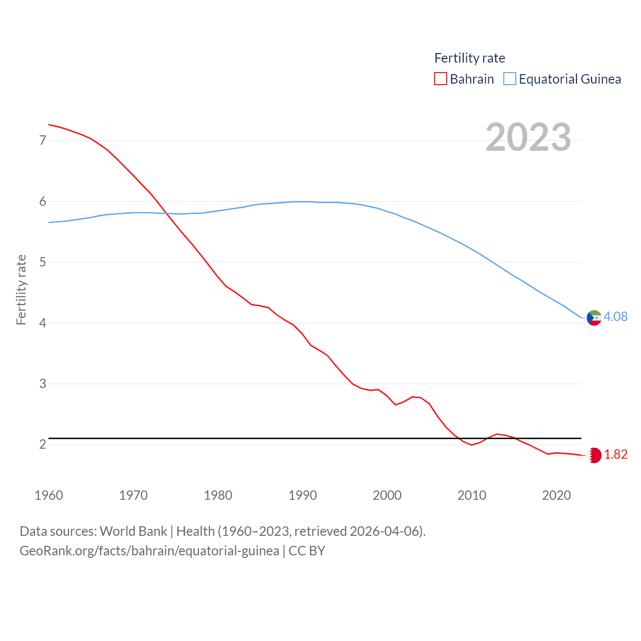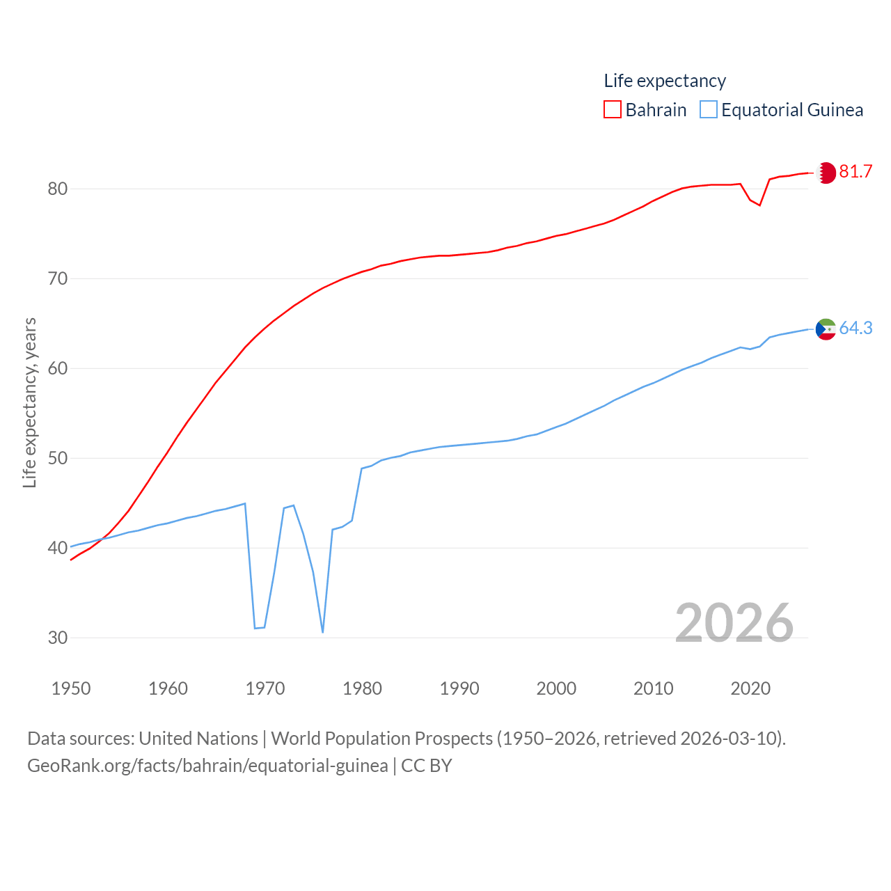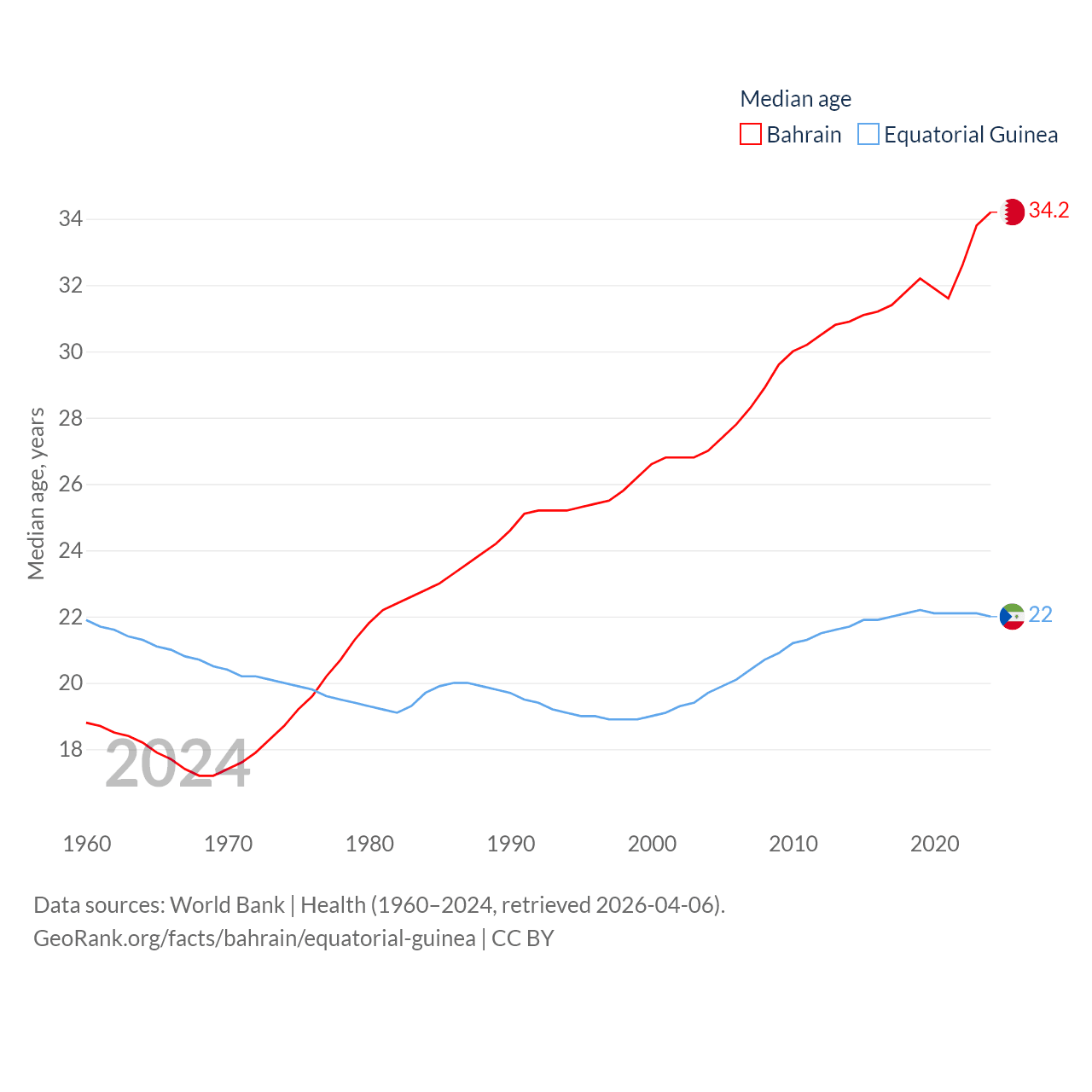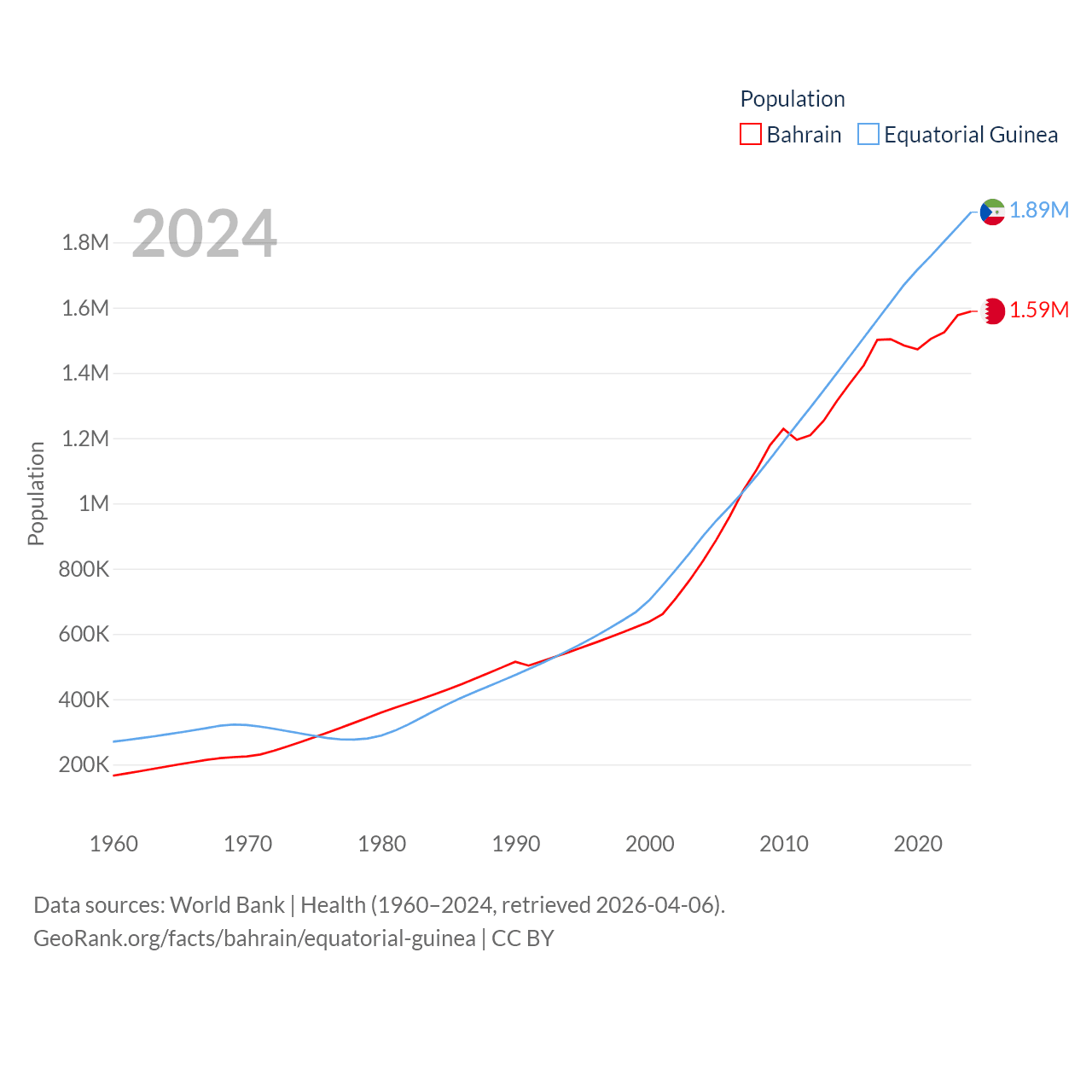 Bahrain has a population of 1.59M (ranked 151/197), compared with 1.89M in Equatorial Guinea (ranked 148/197). Bahrain's land area is 309 sq mi versus 10,830 sq mi for Equatorial Guinea (ranked 174th vs. 140th).