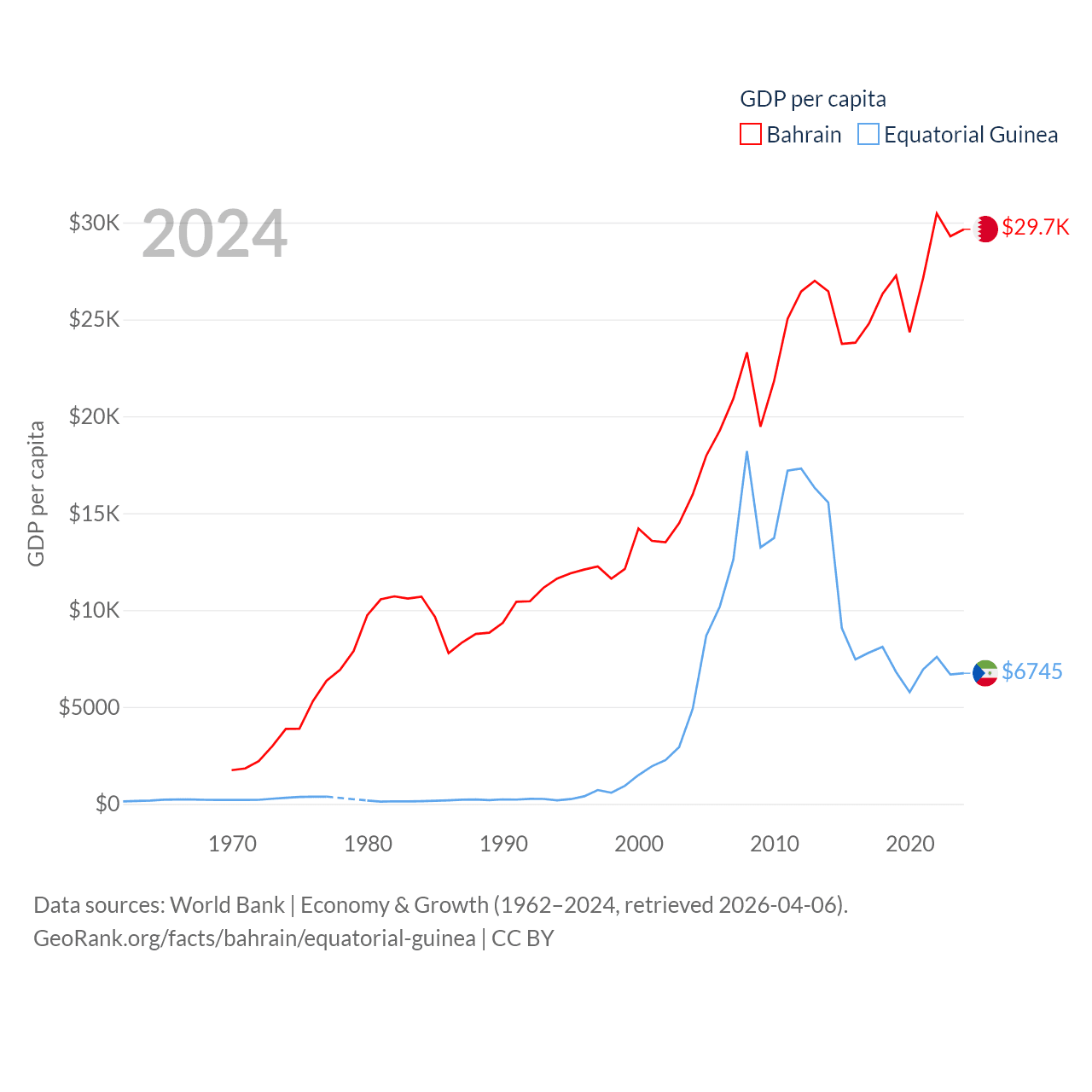 By GDP, Bahrain ranks 96/197 ($47.1B) and Equatorial Guinea ranks 148/197 ($12.8B). By GDP per capita, Bahrain ranks 42/197 ($29,654), while Equatorial Guinea ranks 106/197 ($6,745).