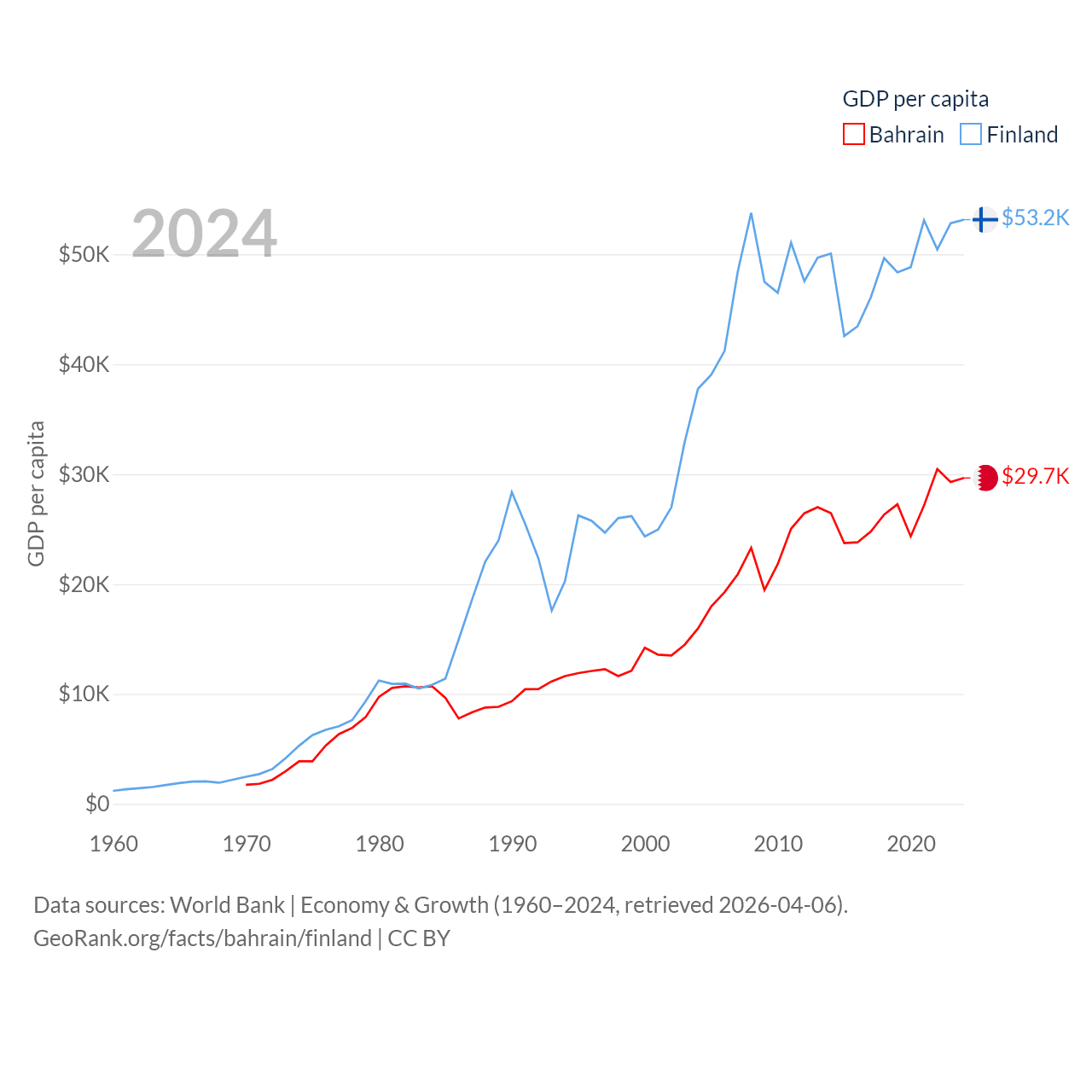 By GDP, Bahrain ranks 96/197 ($47.1B) and Finland ranks 47/197 ($299B). By GDP per capita, Bahrain ranks 42/197 ($29,654), while Finland ranks 23/197 ($53,150).