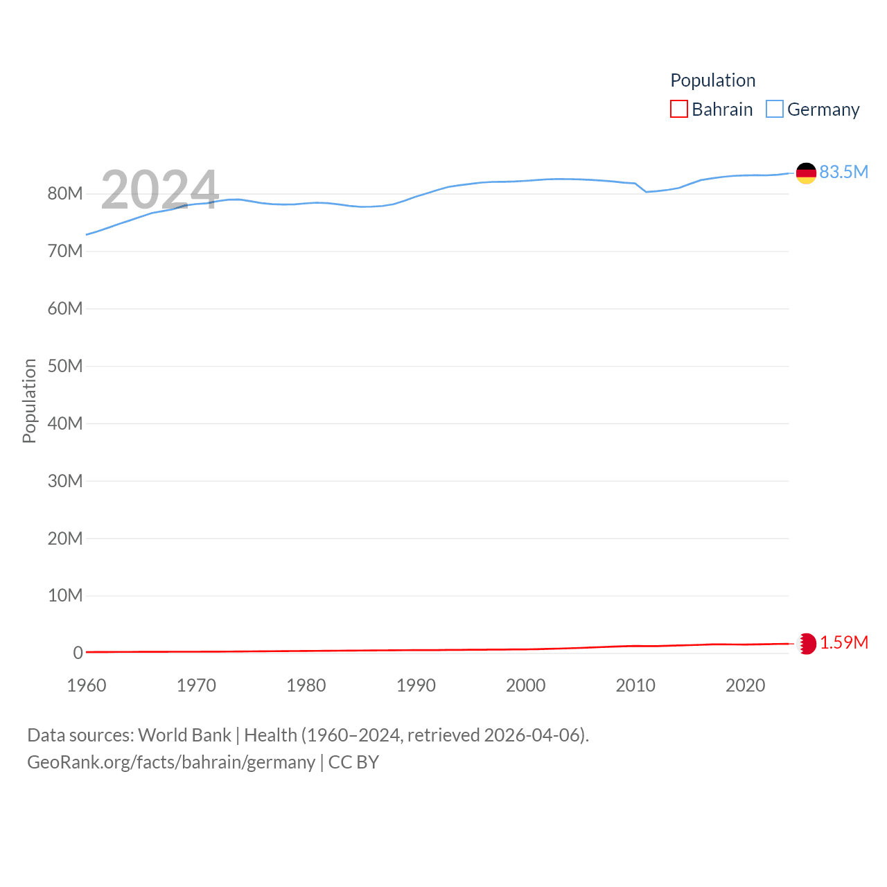 Bahrain has a population of 1.59M (ranked 151/197), compared with 83.5M in Germany (ranked 19/197). Bahrain's land area is 309 sq mi versus 134,916 sq mi for Germany (ranked 174th vs. 63rd).