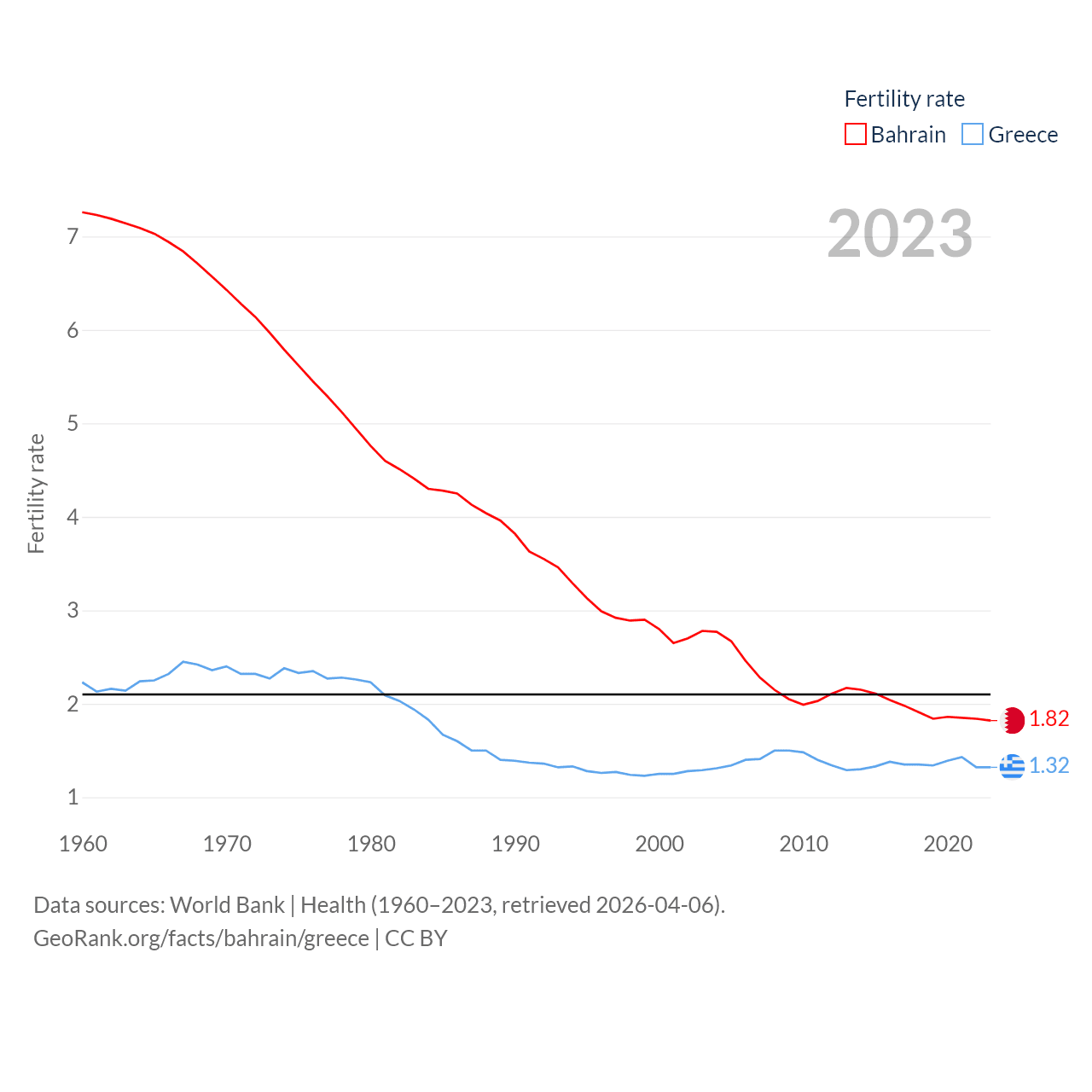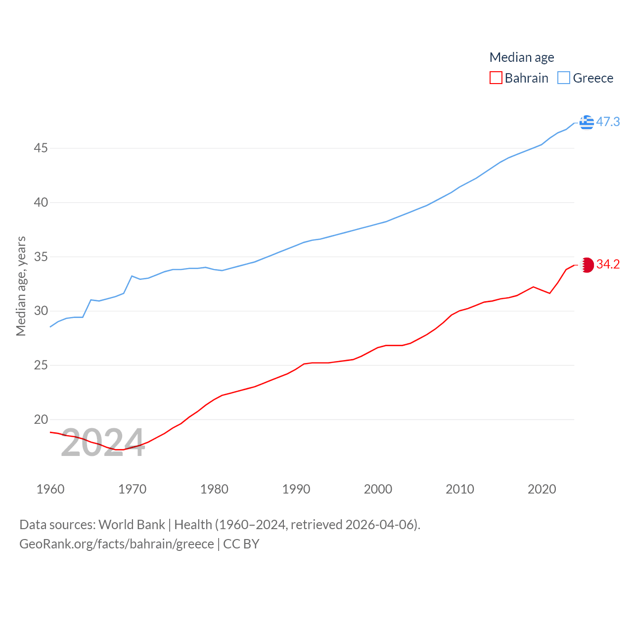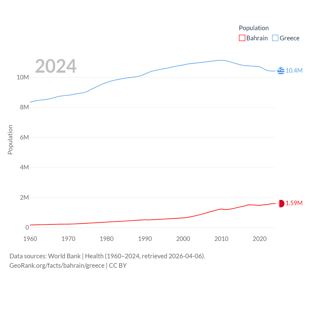 Bahrain has a population of 1.59M (ranked 151/197), compared with 10.4M in Greece (ranked 94/197). Bahrain's land area is 309 sq mi versus 49,769 sq mi for Greece (ranked 174th vs. 95th).