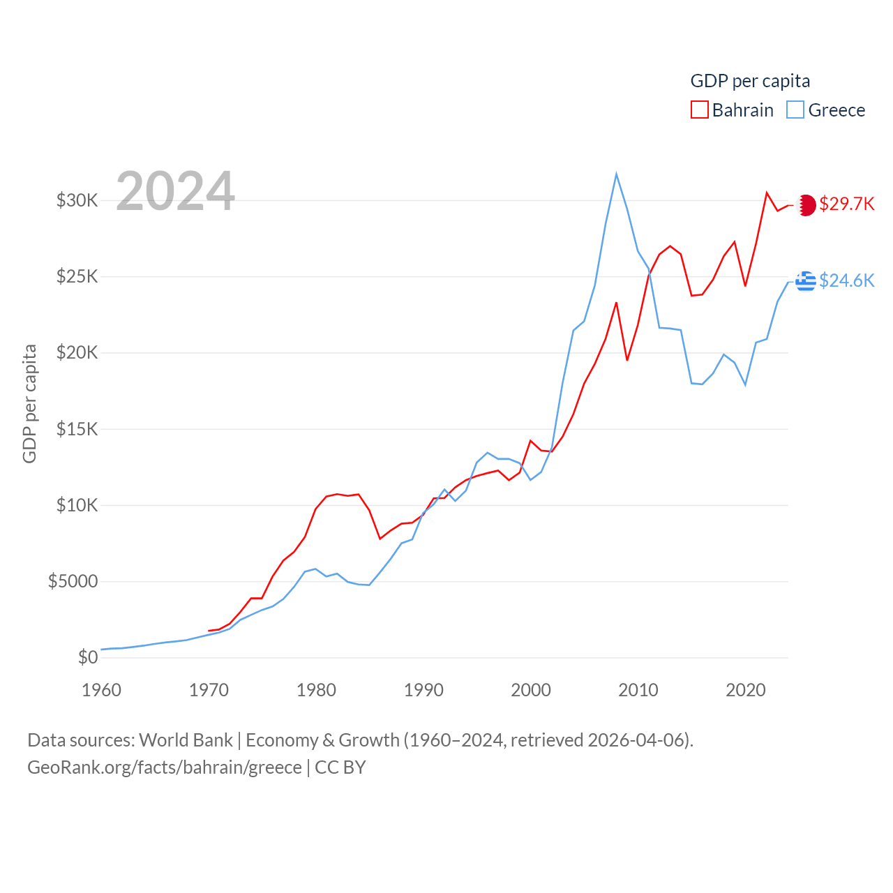 By GDP, Bahrain ranks 96/197 ($47.1B) and Greece ranks 53/197 ($256B). By GDP per capita, Bahrain ranks 42/197 ($29,654), while Greece ranks 49/197 ($24,626).