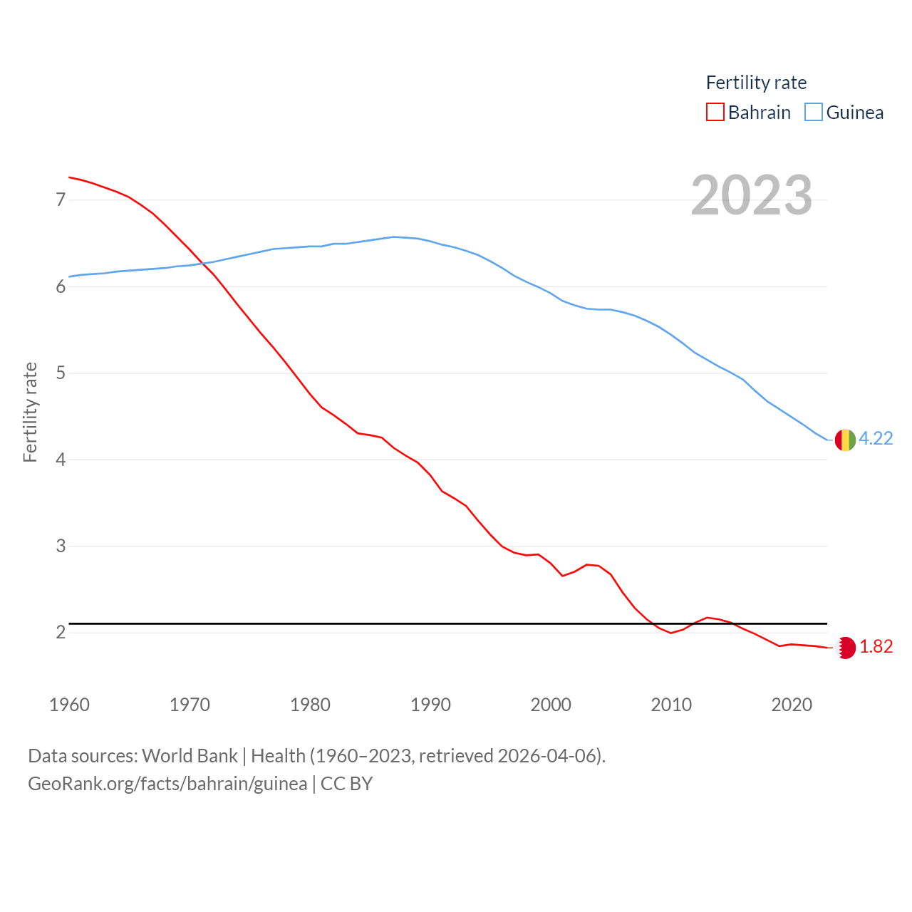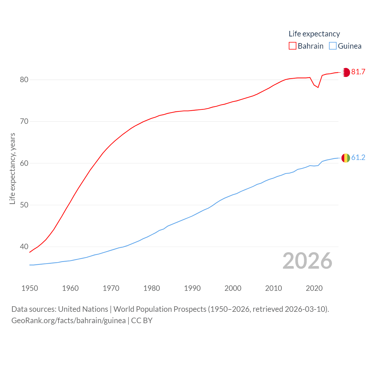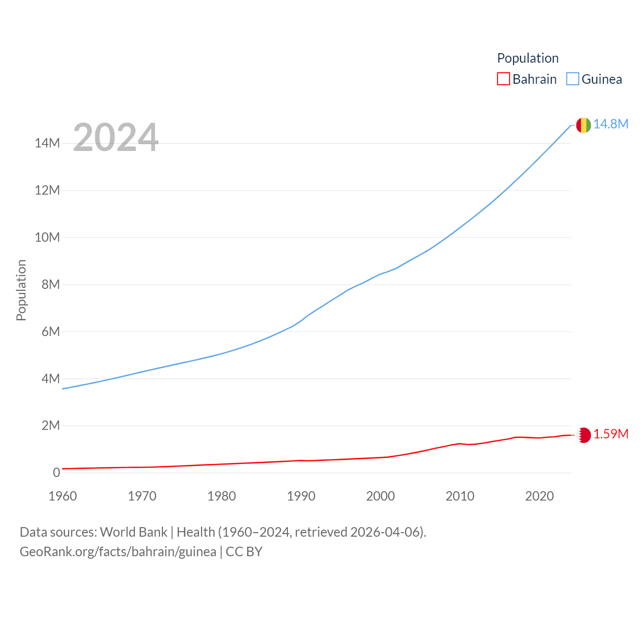 Bahrain has a population of 1.59M (ranked 151/197), compared with 14.8M in Guinea (ranked 75/197). Bahrain's land area is 309 sq mi versus 94,873 sq mi for Guinea (ranked 174th vs. 77th).