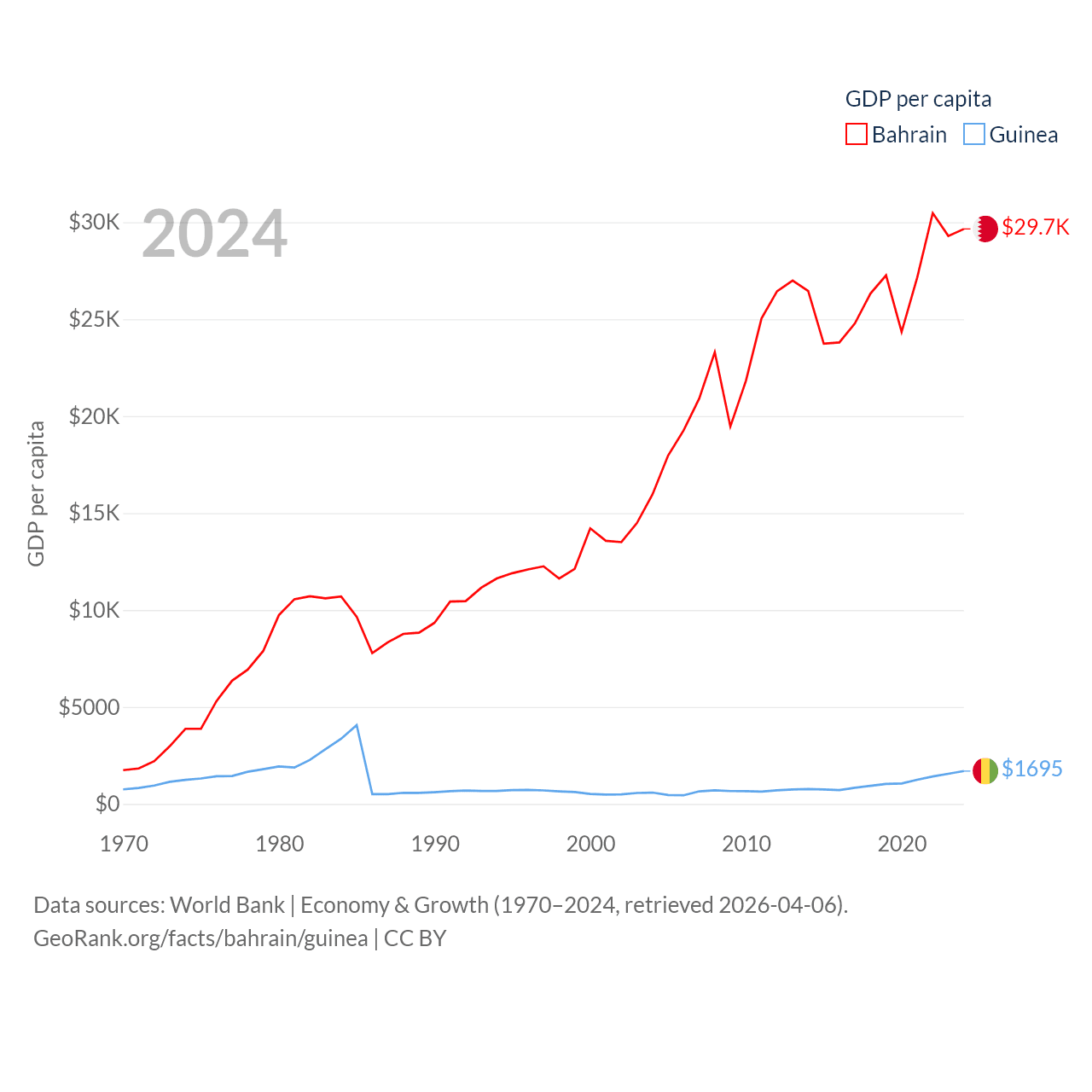 By GDP, Bahrain ranks 96/197 ($47.1B) and Guinea ranks 118/197 ($25B). By GDP per capita, Bahrain ranks 42/197 ($29,654), while Guinea ranks 160/197 ($1,695).