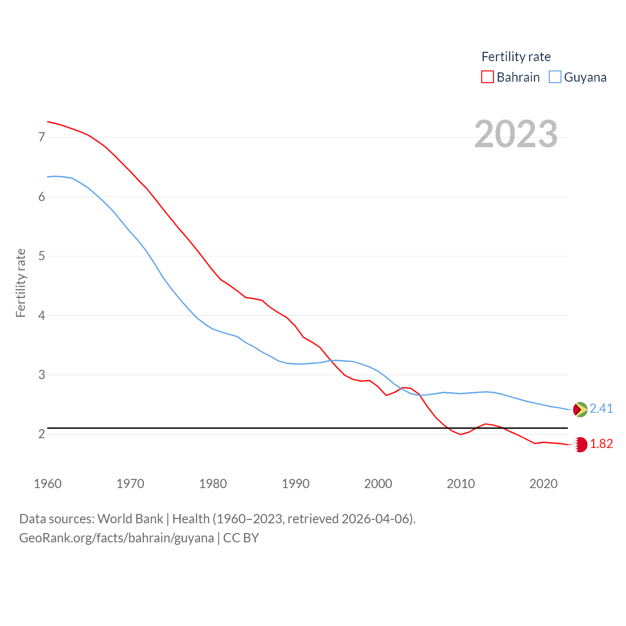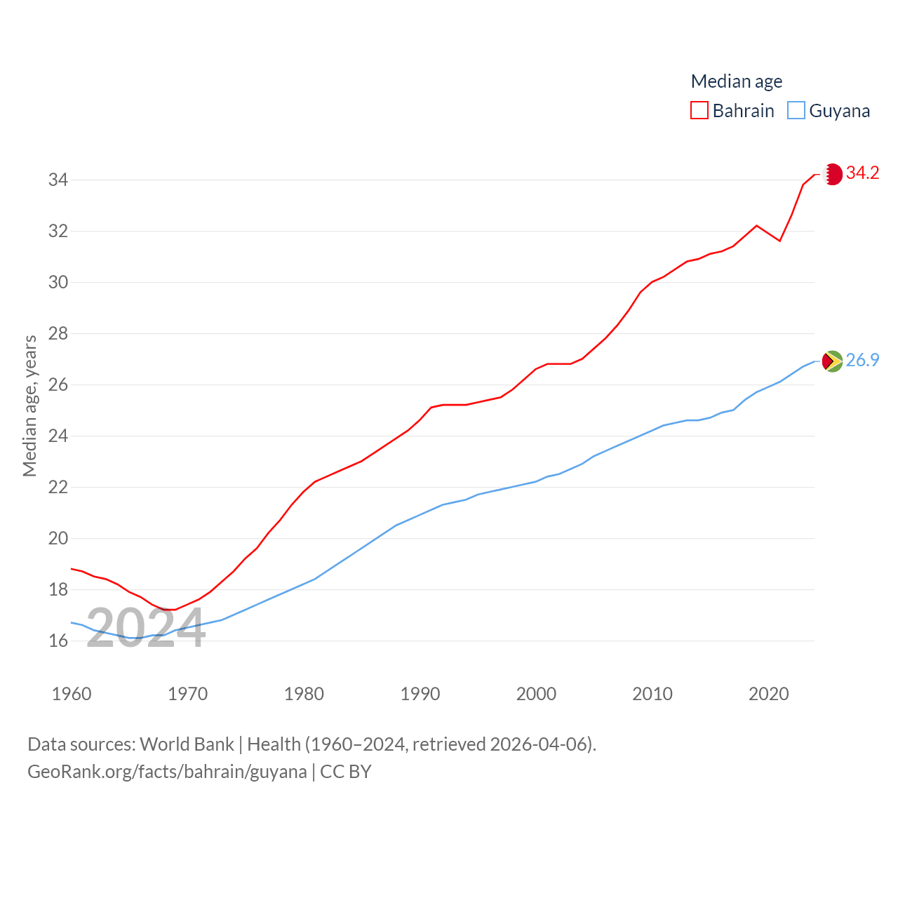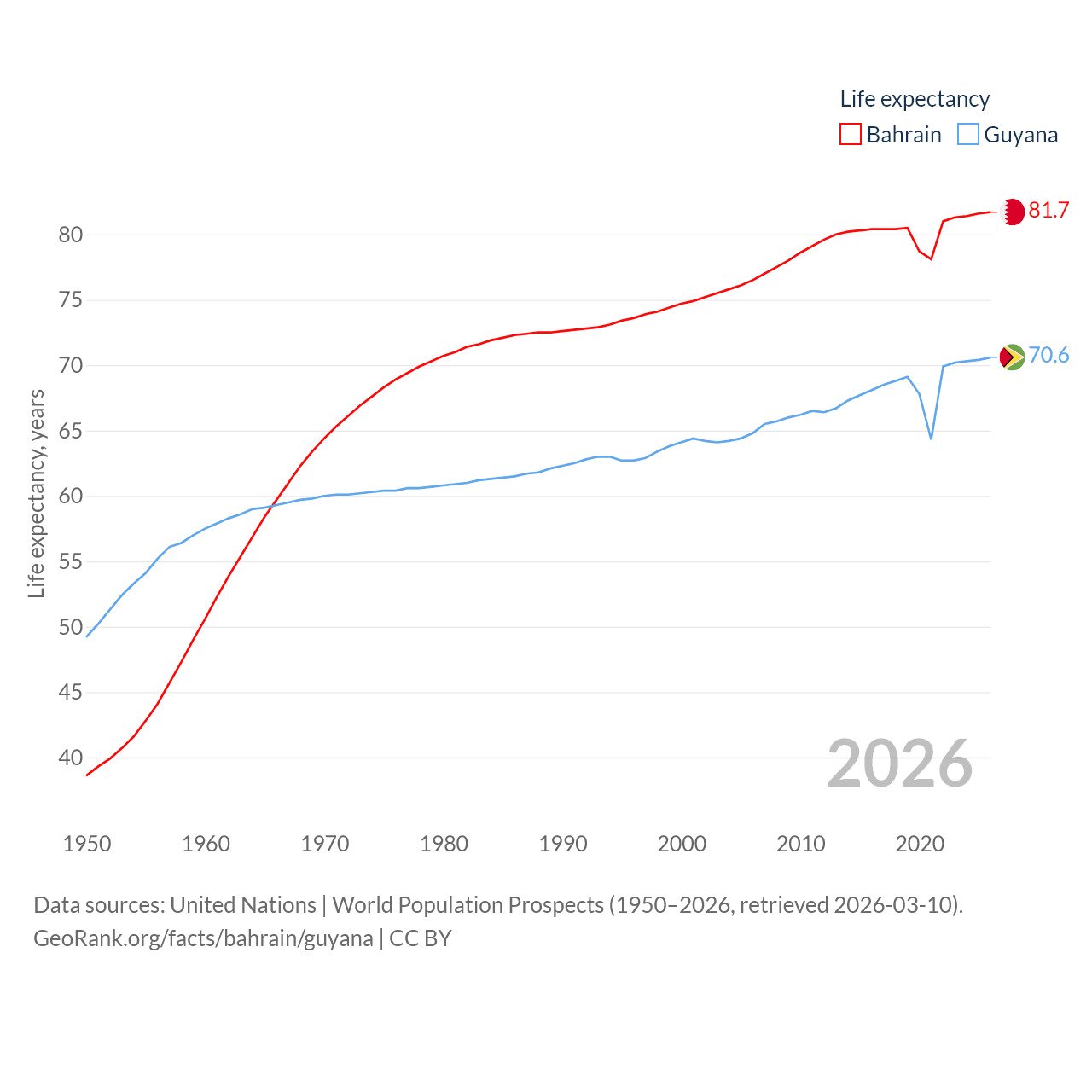 Bahrain has a population of 1.59M (ranked 151/197), compared with 831K in Guyana (ranked 161/197). Bahrain's land area is 309 sq mi versus 81,522 sq mi for Guyana (ranked 174th vs. 82nd).