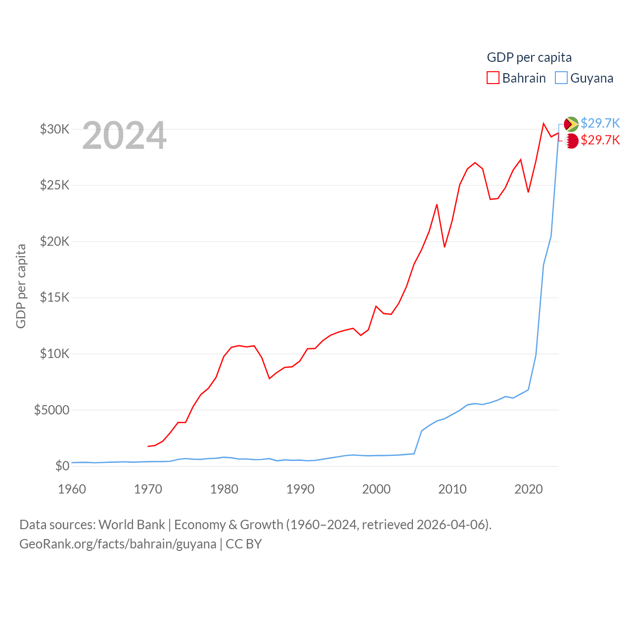 By GDP, Bahrain ranks 96/197 ($47.1B) and Guyana ranks 120/197 ($24.7B). By GDP per capita, Bahrain ranks 42/197 ($29,654), while Guyana ranks 41/197 ($29,675).