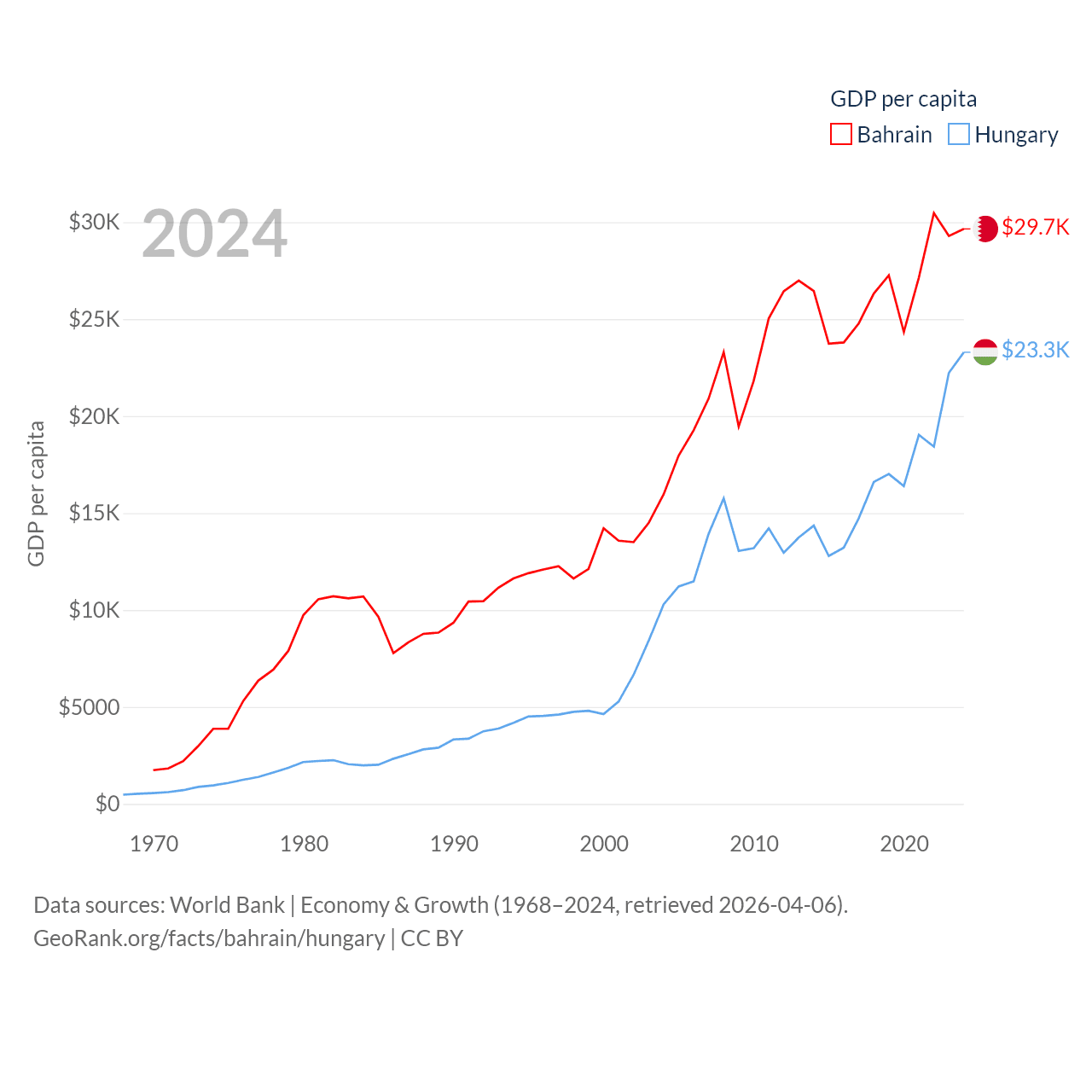 By GDP, Bahrain ranks 96/197 ($47.1B) and Hungary ranks 55/197 ($223B). By GDP per capita, Bahrain ranks 42/197 ($29,654), while Hungary ranks 55/197 ($23,292).