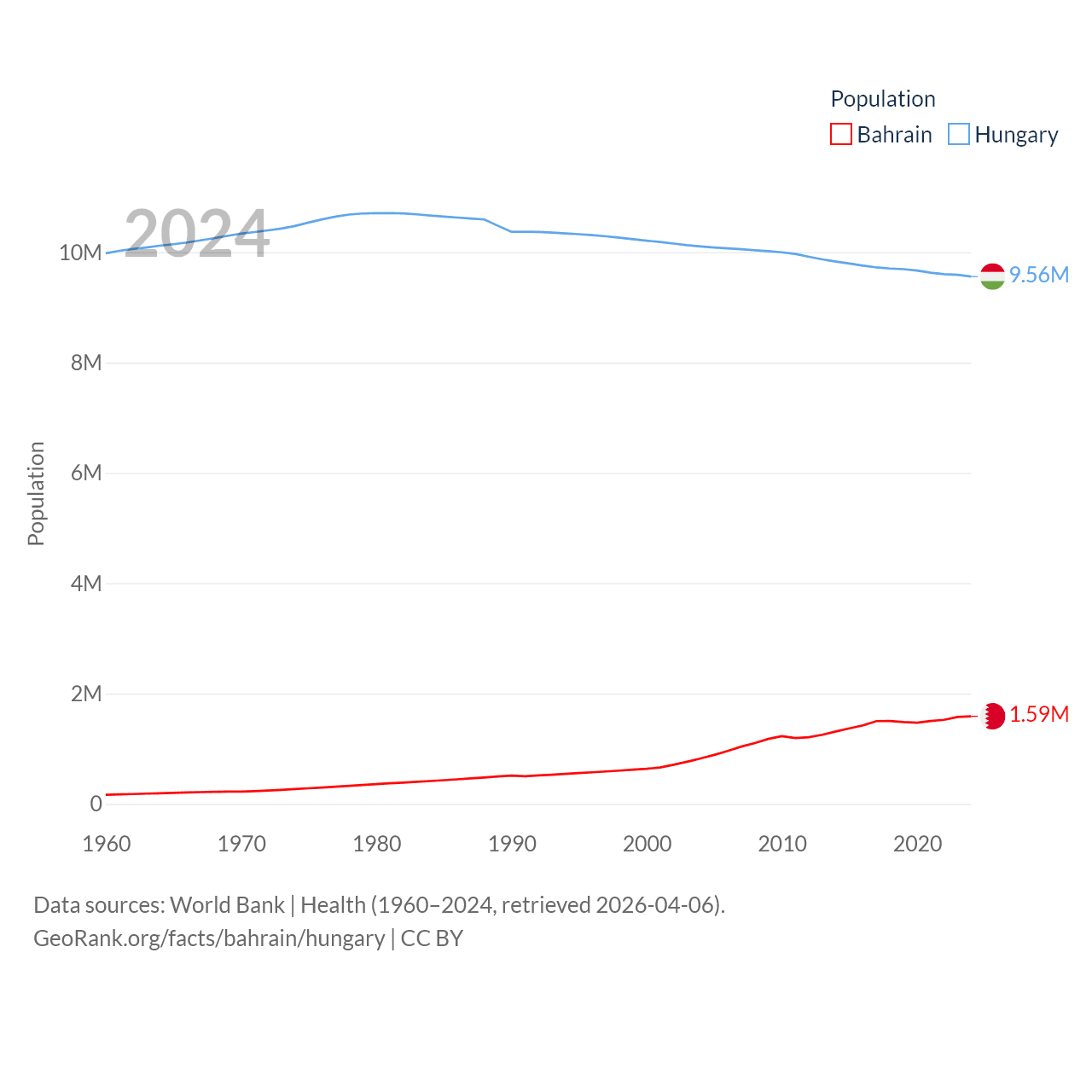Bahrain has a population of 1.59M (ranked 151/197), compared with 9.56M in Hungary (ranked 97/197). Bahrain's land area is 309 sq mi versus 35,236 sq mi for Hungary (ranked 174th vs. 109th).