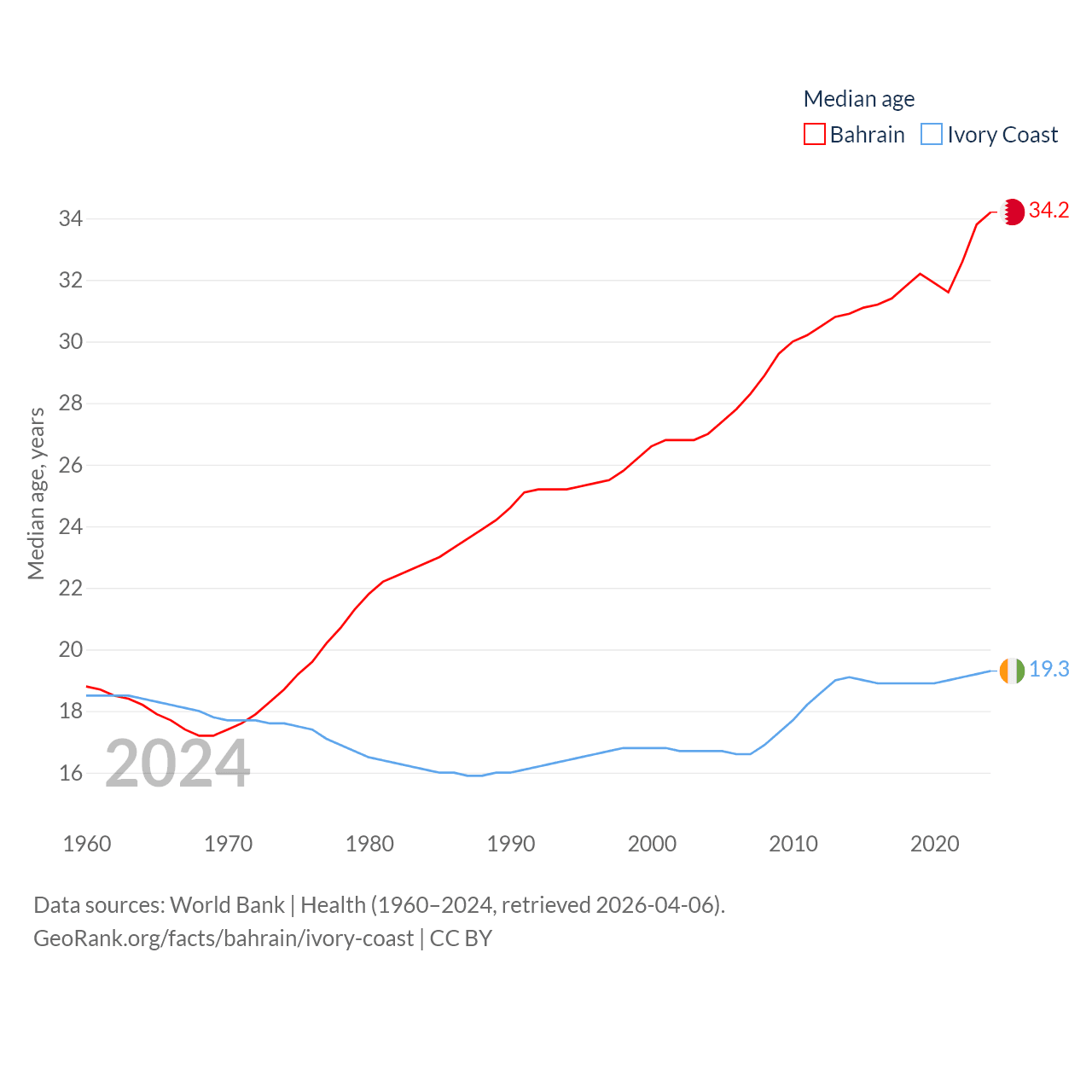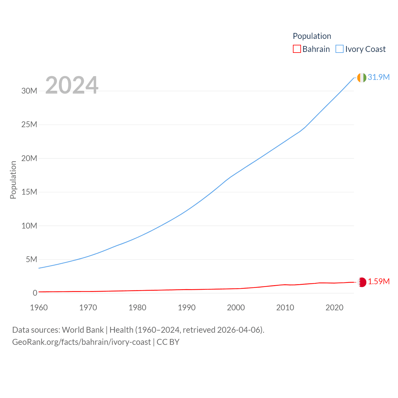 Bahrain has a population of 1.59M (ranked 151/197), compared with 31.9M in Ivory Coast (ranked 50/197). Bahrain's land area is 309 sq mi versus 122,780 sq mi for Ivory Coast (ranked 174th vs. 66th).