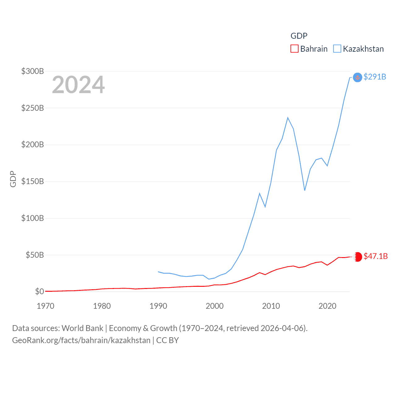 By GDP, Bahrain ranks 96/197 ($47.1B) and Kazakhstan ranks 48/197 ($291B). By GDP per capita, Bahrain ranks 42/197 ($29,654), while Kazakhstan ranks 71/197 ($14,155).