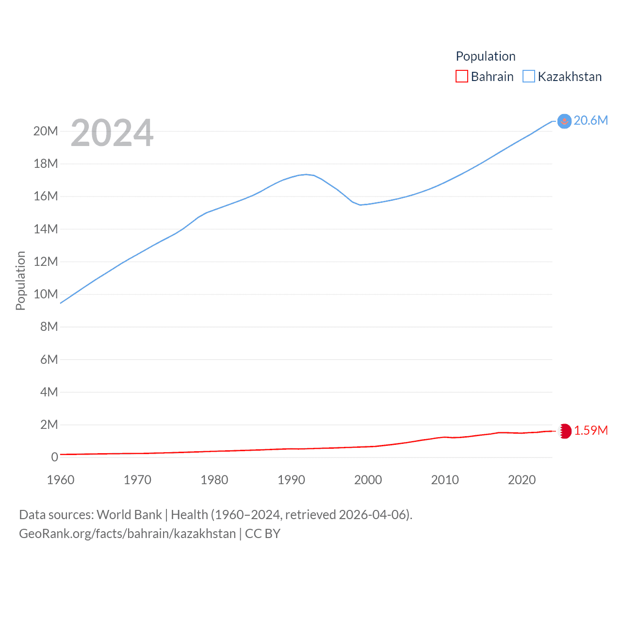 Bahrain has a population of 1.59M (ranked 151/197), compared with 20.6M in Kazakhstan (ranked 64/197). Bahrain's land area is 309 sq mi versus 1,042,360 sq mi for Kazakhstan (ranked 174th vs. 9th).