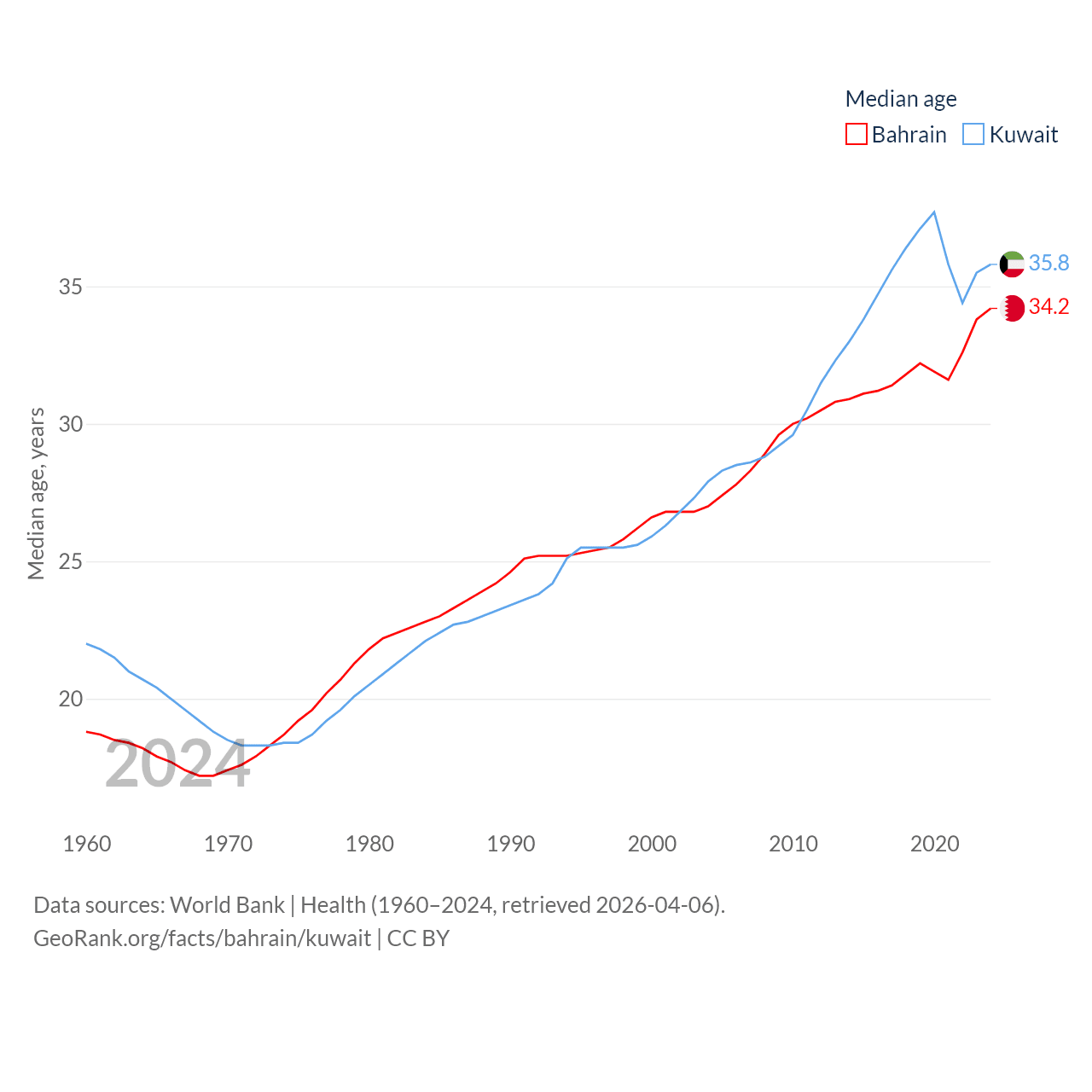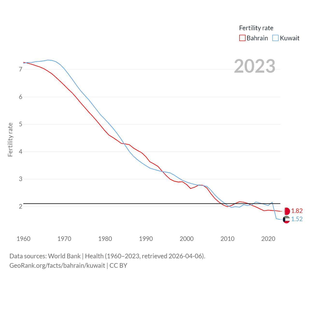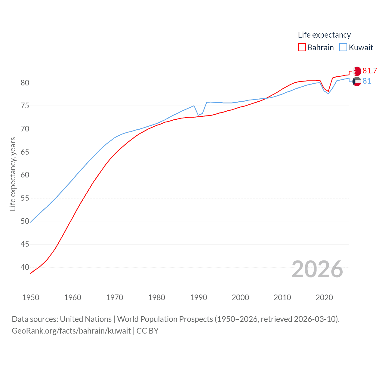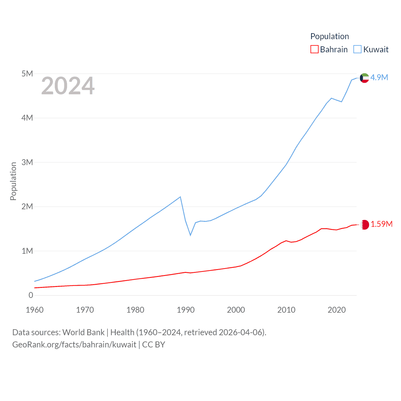 Bahrain has a population of 1.59M (ranked 151/197), compared with 4.9M in Kuwait (ranked 127/197). Bahrain's land area is 309 sq mi versus 6,880 sq mi for Kuwait (ranked 174th vs. 153rd).